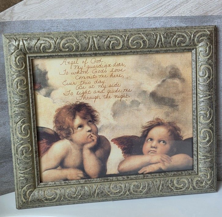 Vintage Cherub print with Angel of God prayer The iconic image of the two cherubs (putti) found at the bottom of Raphael's High Renaissance masterpiece, the Sistine Madonna. The Angel of God Prayer is written in cursive. "Angel of God, My guardian dear, To whom God's love Commits me here, Ever this day Be at my side To light and guide me Through the night." The print is housed in an ornate, antique-style frame with a decorative, scrolled design. The framed print is pre-owned from the 1990s, in good vintage condition. Measures approx. 11" x 12.5" with frame