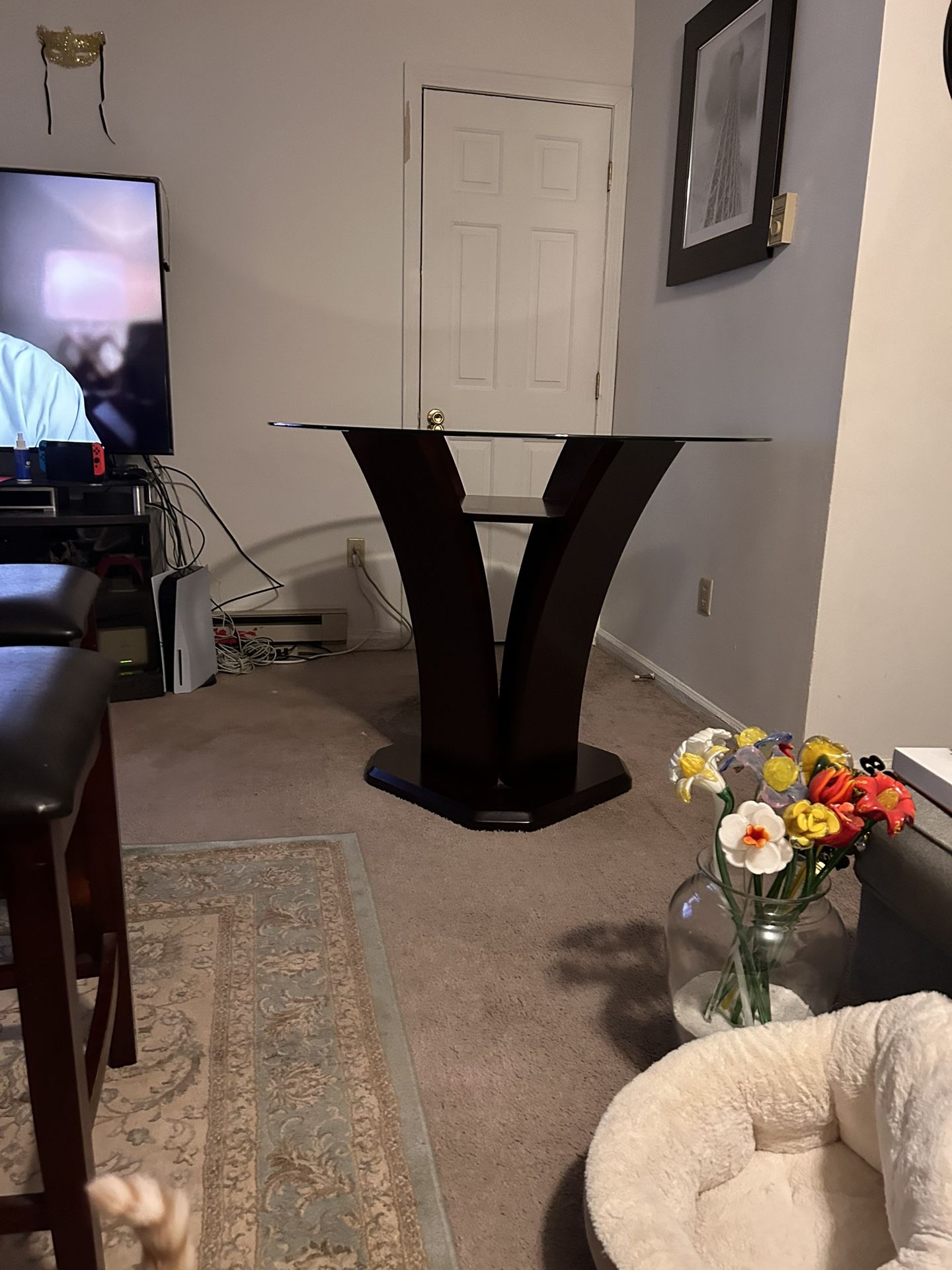 The table has a little scratch on it. The four chairs are perfectly good except for marks from the cats, nails, and a scratch besides, that the table and chairs are in good condition,