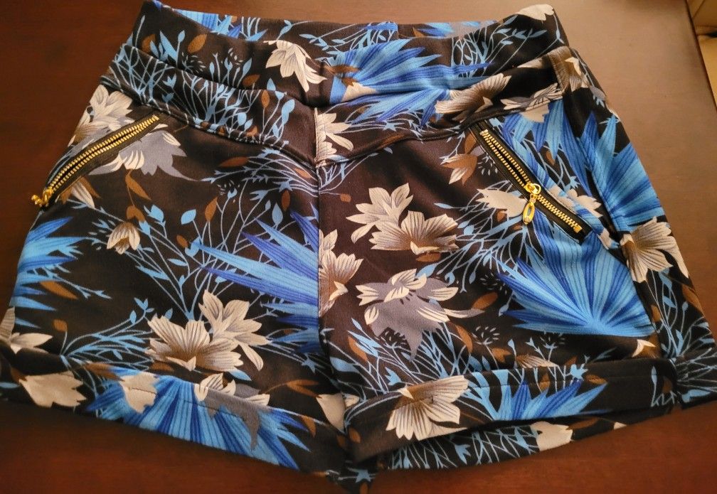 STVLC Black floral shorts feature a vibrant all-over flower print and functional side zippers. Size XL/XXL. Product Overview Design: Black base with a dense pattern of white, blue palms Key Features: Two side pockets secured with gold-tone zippers and cuffed hems. Measures Waist 28 inches x Length 12 inches