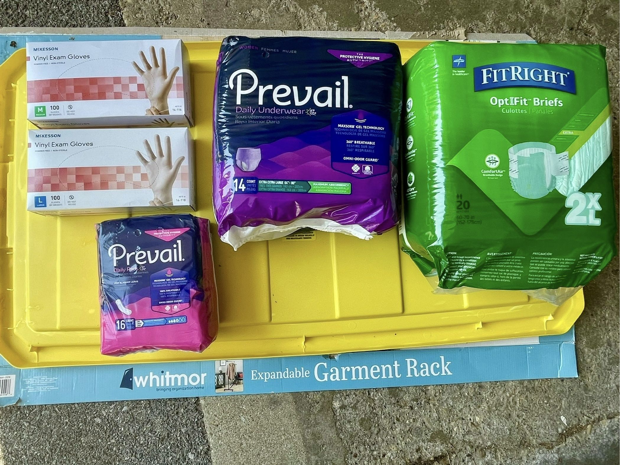 Prevail Daily Underwear size Extra Extra Large 64-80” Maxium absorbency Women light purple in color Maxsorb Gel Technology 360 degree Breathable Omni-Odor Guard 14 count $3 a bag I have 16 bags Sold 1 bag FitRight Optifit Briefs Size 2XL 60-70” Extra Absorbency Comfort Air Breathable Design Pull away side tabs 20 count $3 a bag I have 3 bags Prevail Daily Pads For bladder leaks Moderate Absorbency Long Maxsorb Gel Technology 100% Breathable Omni-Odor Guard 16 count $3 a bag I have 24 bags Sold 2 bags McKesson Vinyl Exam Gloves Powder Free Non-Sterile Size M and Size L 100 count $3 a box I have 20 boxes of size M sold 2 boxes OR BUY MORE AND SAVE 4 bags/boxes for $10 8 bags/boxes for $20