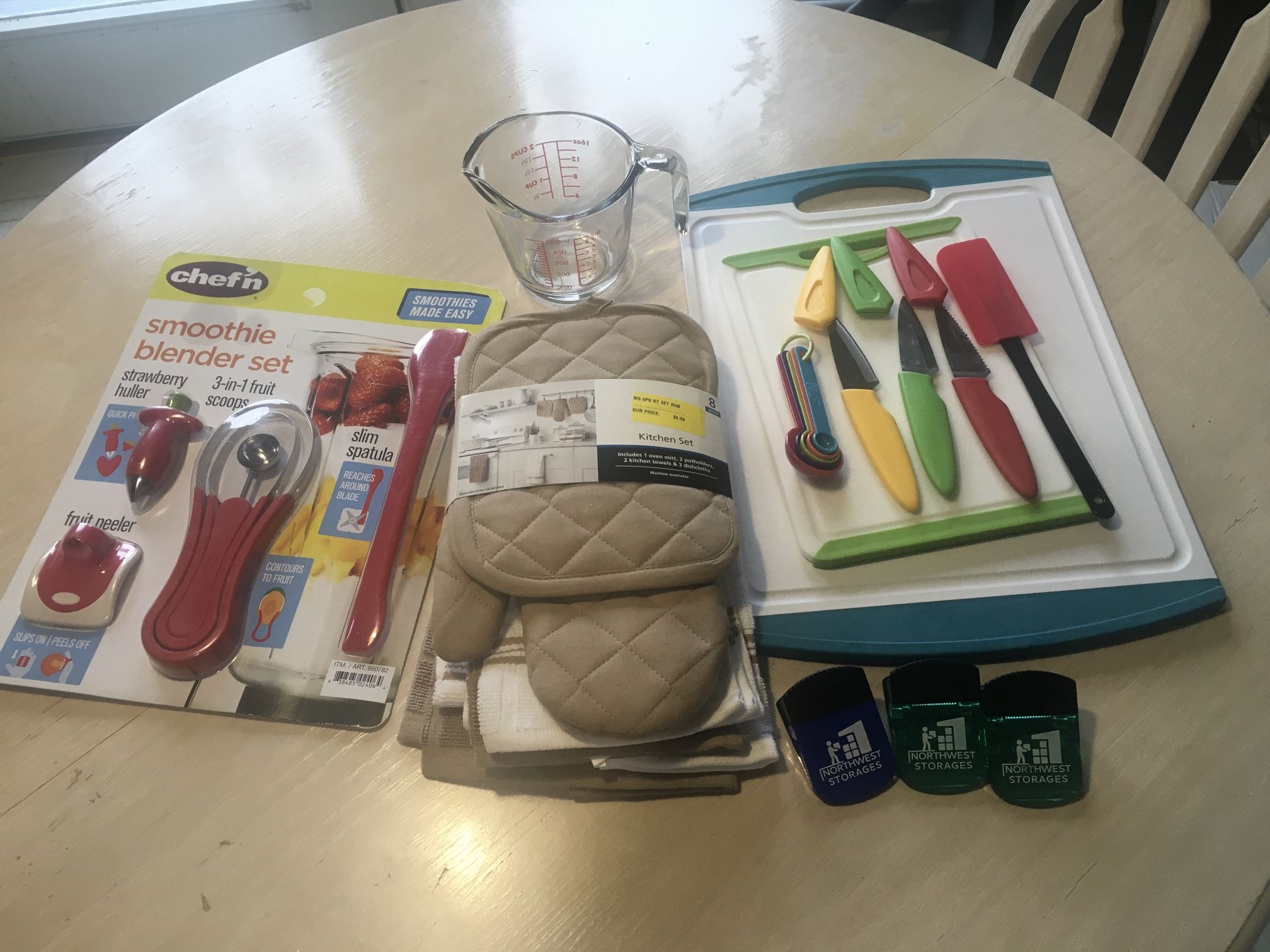 Awesome kitchen bundle! Has a new smoothie blender set with strawberry huller, fruit scoops, slim spatula, and fruit peeler. Also includes a new 8-piece kitchen set (oven mitt, 2 potholders, 2 kitchen towels, 3 dishcloths), 2 cup glass measuring cup, 2 white cutting board, colorful knife set, red silicone spatula, rainbow measuring spoons and 3 magnetic bag clips. Aso one white plastic organizer didn’t make first picture. Everything looks new except knives and cutting boards. Meet up in N Auburn.