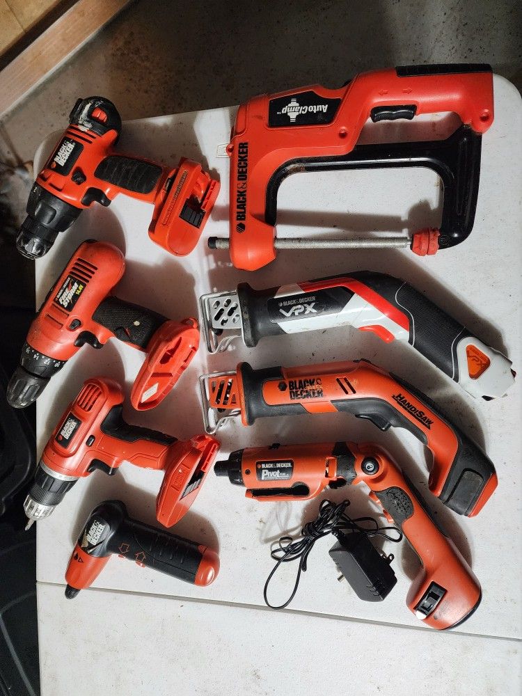 Lot of black and decker battery powered tools, good condition, but some no chargers and some no batteries (tool only). Lot includes: 3 various drills 1 mini drill (uses regular household batteries) 2 handheld reciprocating saws Pivot drill Auto clamp With the above description, the whole lot is $120 Check out my other items for sale!