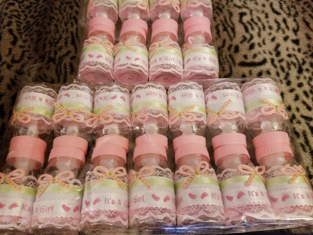 Bottles beautifully done for baby girl baby shower 15 dollars for 22 favors NEW shipping will either be small box or if I can fit in padded envelope it will be less expensive I do not enjoy paying high price for shipping so I try to do my best to keep shipping low :) ty