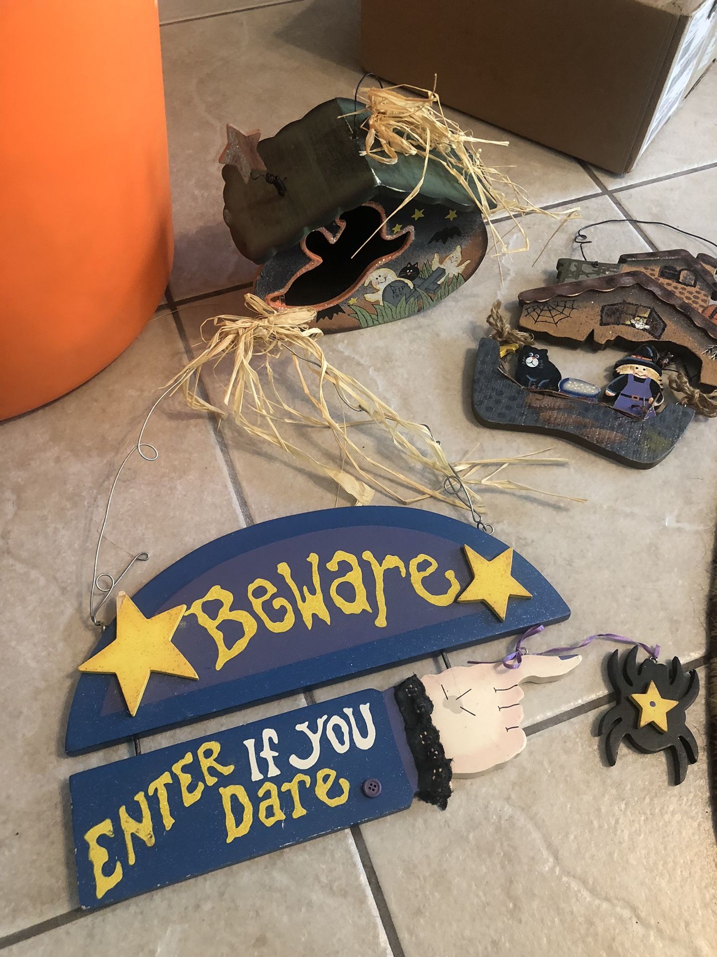 Each item runs from $2and up to $8 These are unique. If you would want them all we can come to a reasonable price . 4 Halloween π tricka treat $2 2 Adult long length cloaks $12 ea Witch π§π»ββοΈ costume 3 piece $12 2 door entrance Happy Halloween matβs $2