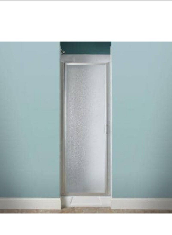 Brand new. Still in box. 24" x 64" framed pivot shower door kit. Silver with pebble glass for privacy.