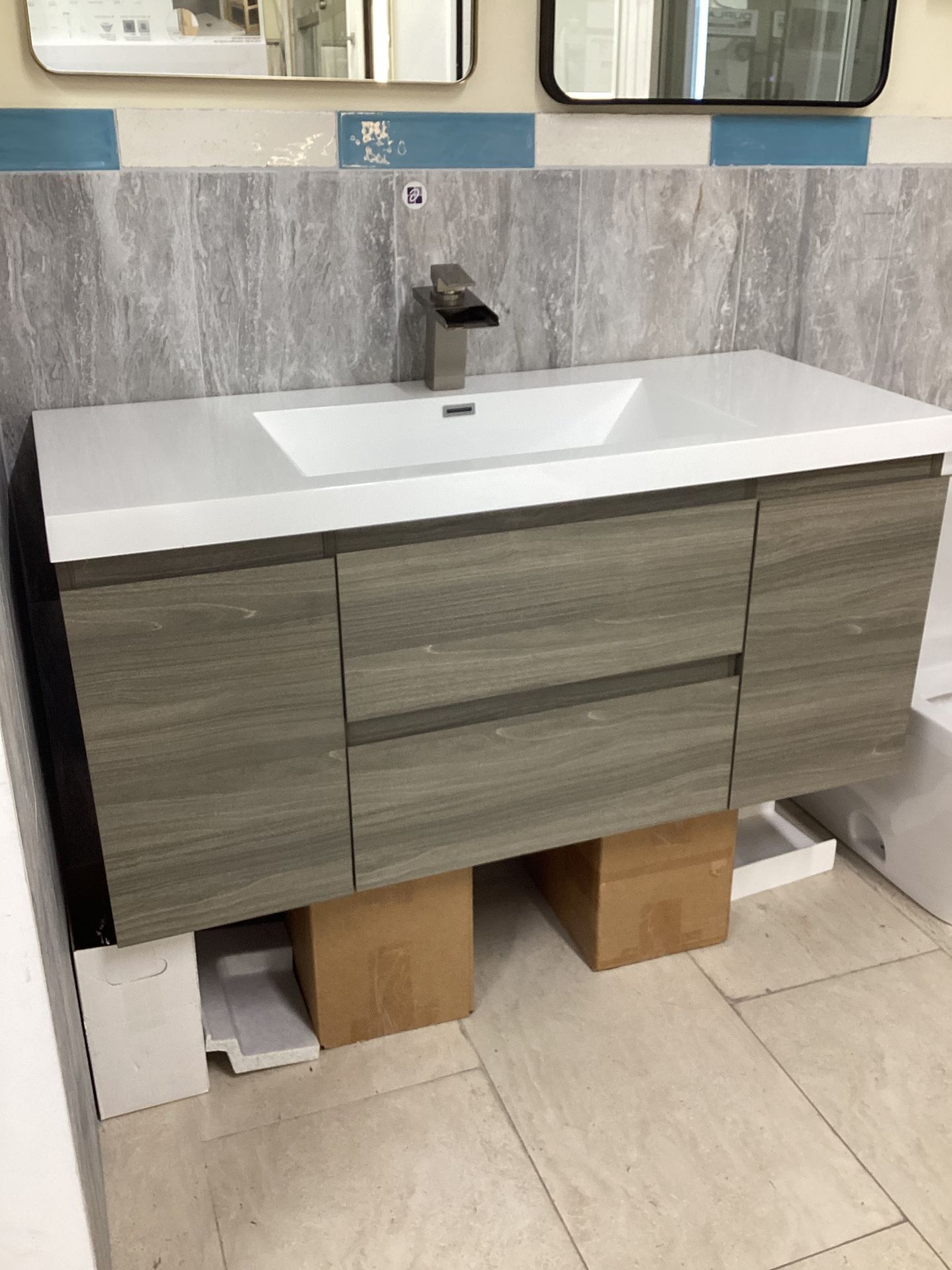 48” floating vanity oak finish, acrylic top, available for pick up