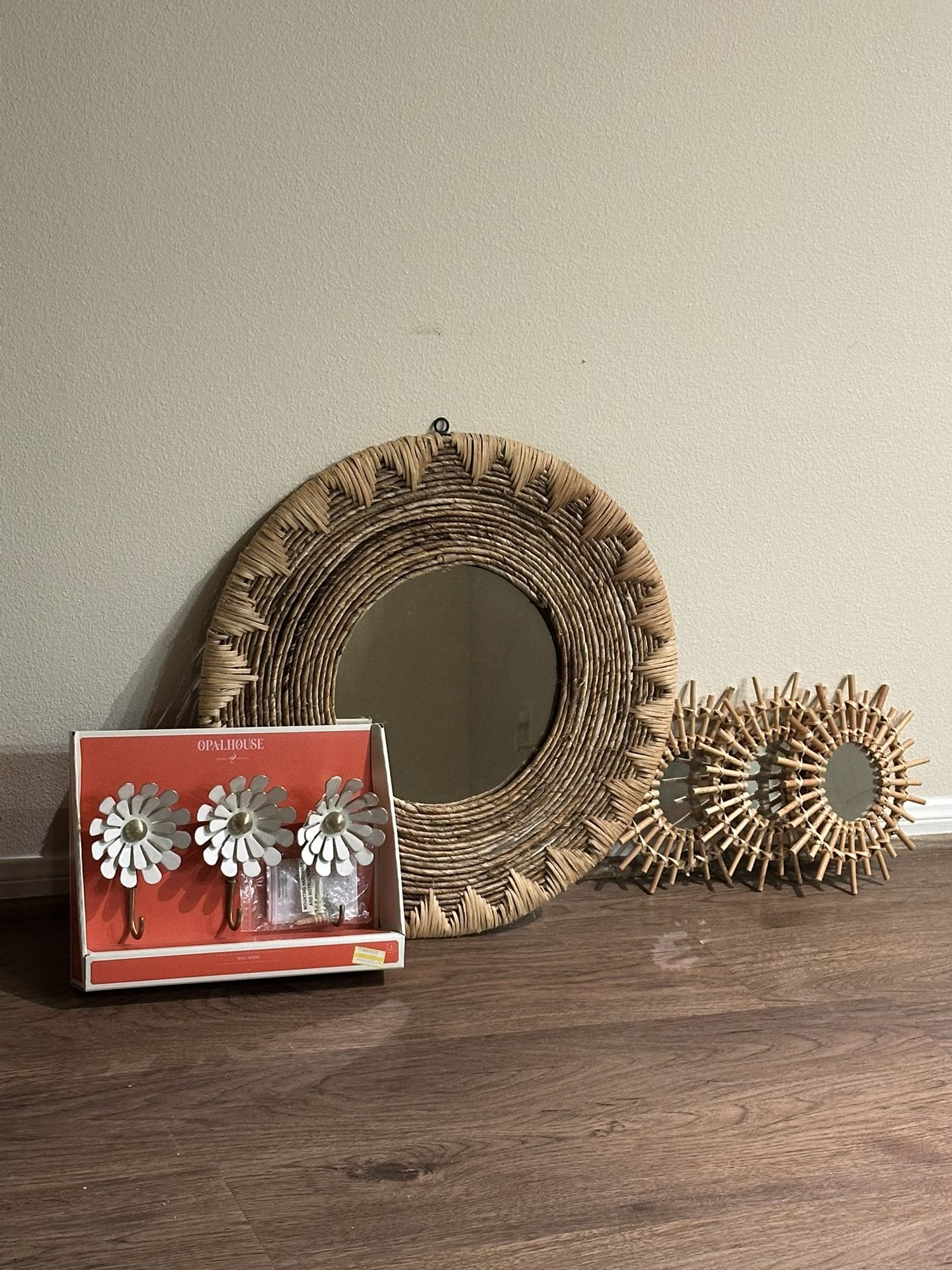 Selling everything together for $25. Set includes: • 1 Boho Wall Mirror – 23.5” diameter • 3 Round Bamboo Wall Mirrors – 11.5” diameter each • 1 Opalhouse Decorative Enamel Flower Wall Hook Set