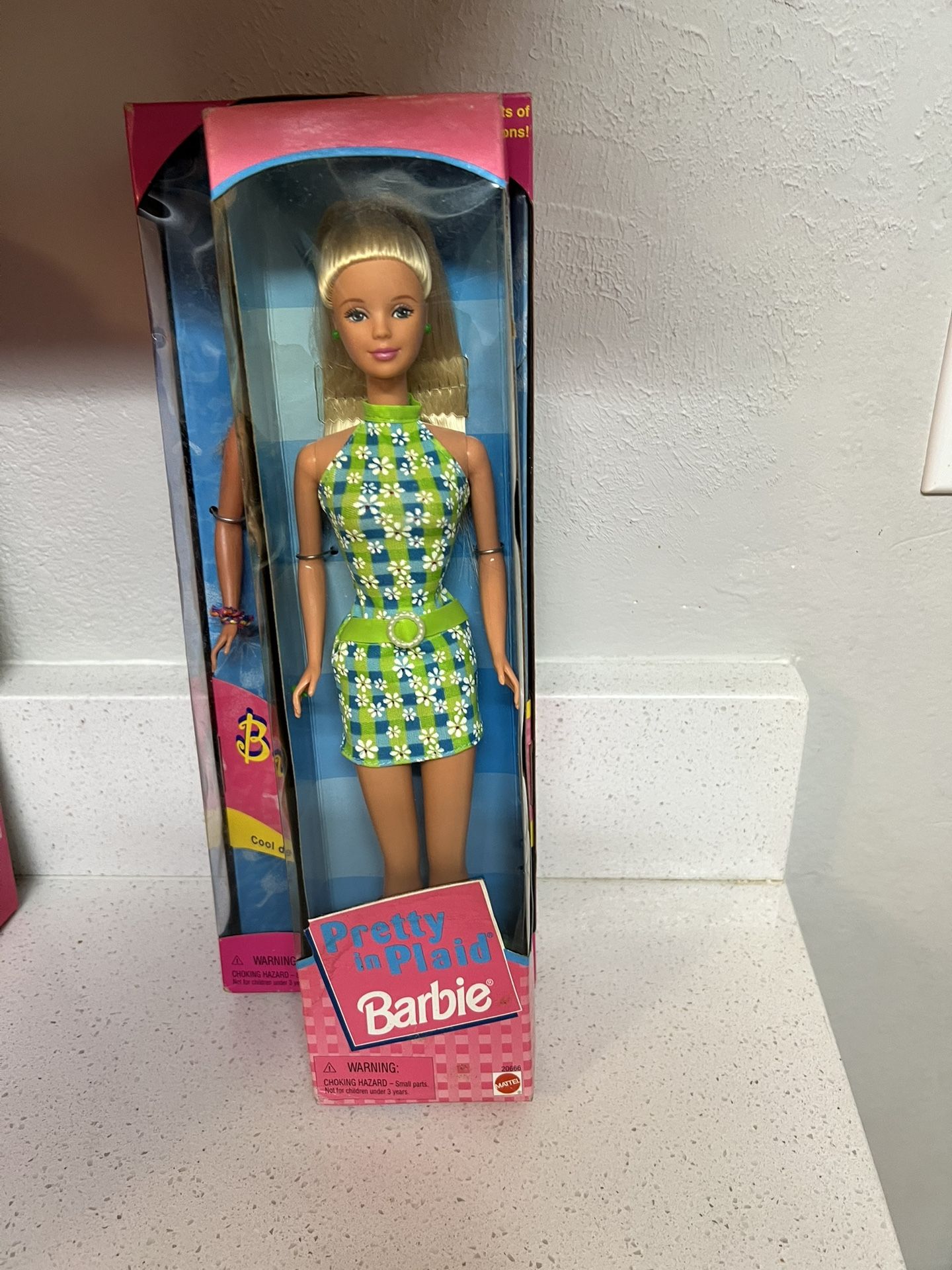 1998 Mattel Pretty In Plaid Barbie doll with blonde hair and a green and blue daisy-patterned dress. The doll features bendable limbs and long, straight hair. It comes with matching green shoes, earrings, and a removable ring. The dress is easy to remove with a Velcro fastener. Box damage
