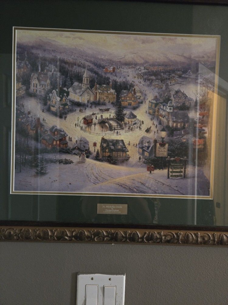 Thomas Kinkade was a great painter who died recently. His prints and paintings were dubbed the painter of light. This one is a winter scene of a community. This item can be shipped, but in person pick-up is preferable. The price is negotiable.