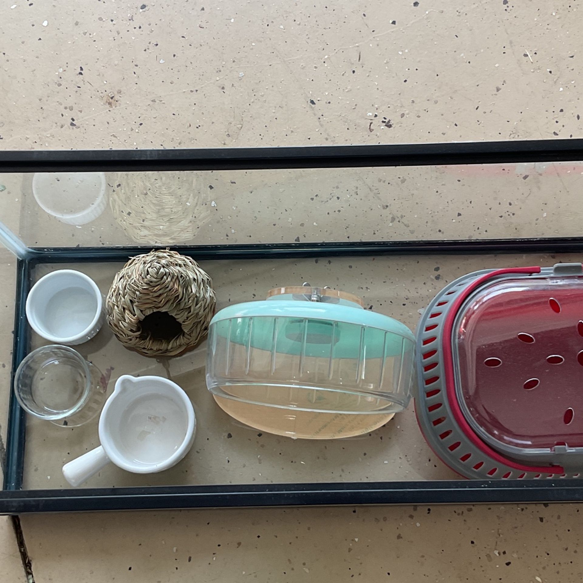 20 gallon hamster cage which includes a living world carrier cage, Niteangel wheel, water and food dish, and a hamster hut. This is a suitable home for a smaller hamster looking for an adorable home! All items in good condition and are good quality!