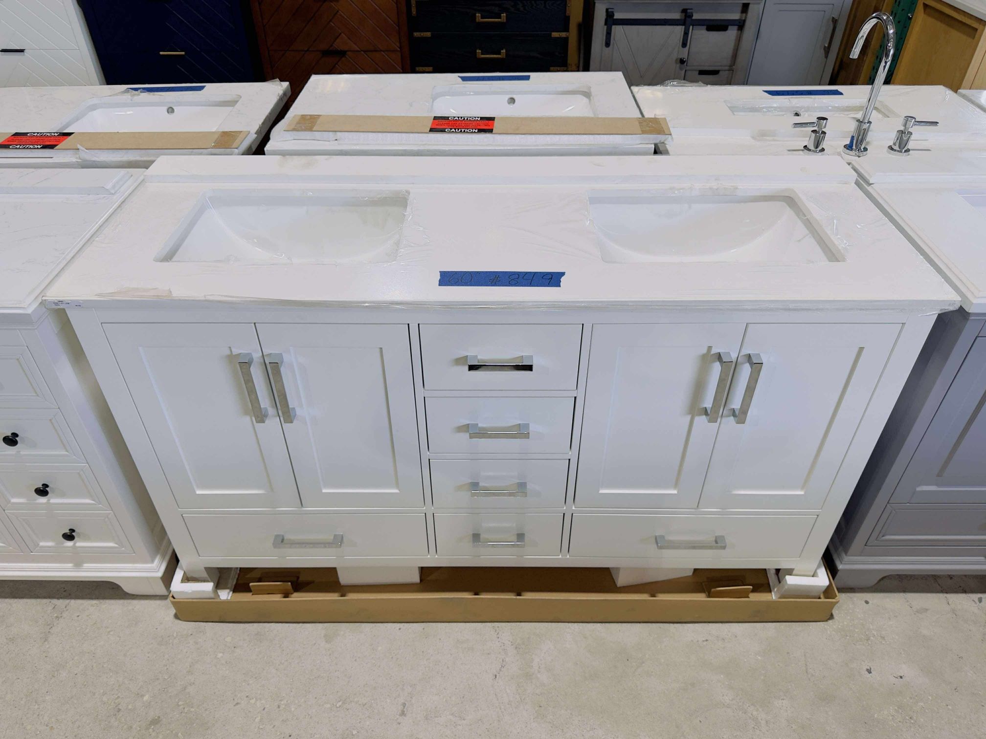 Beautiful Bathroom Vanity in White “60” double sink, Soft Close Solid Wood, 6 drawers and 4 doors and modern handles with Marble Top in White $849