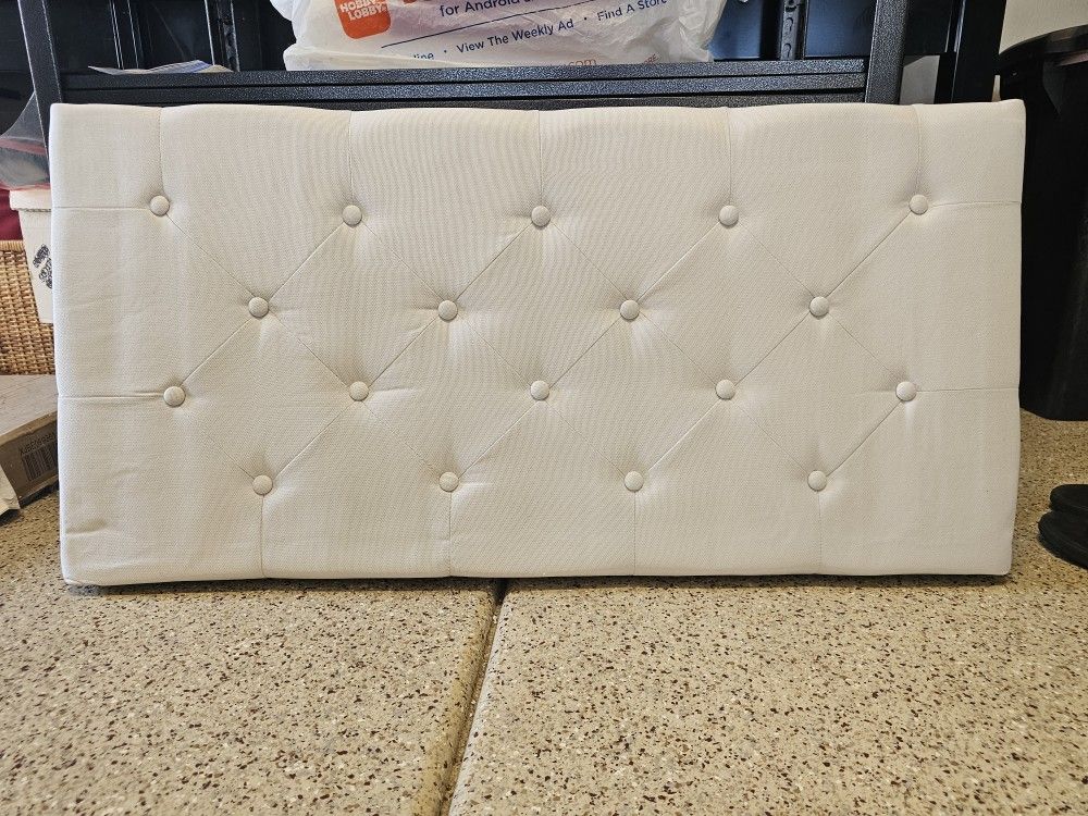 New open box bed frame, looks like pic of gray bed , white is unassembled, other pic is white chenille bed frame with headboard and footboard