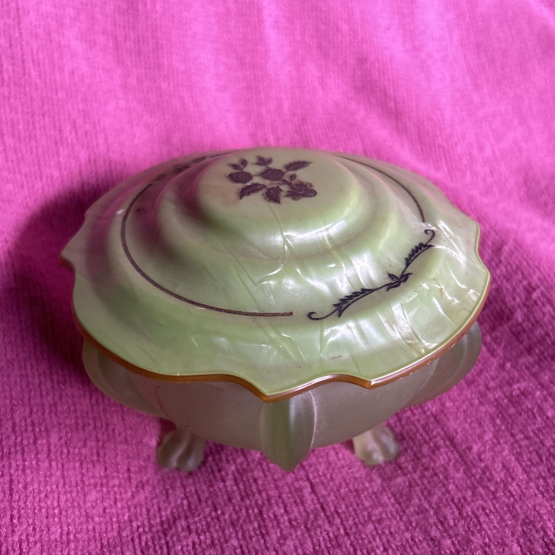Vintage Art Deco Powder Jar Footed Green Glass Base with lid. No cracks, no chips. Normal wear.