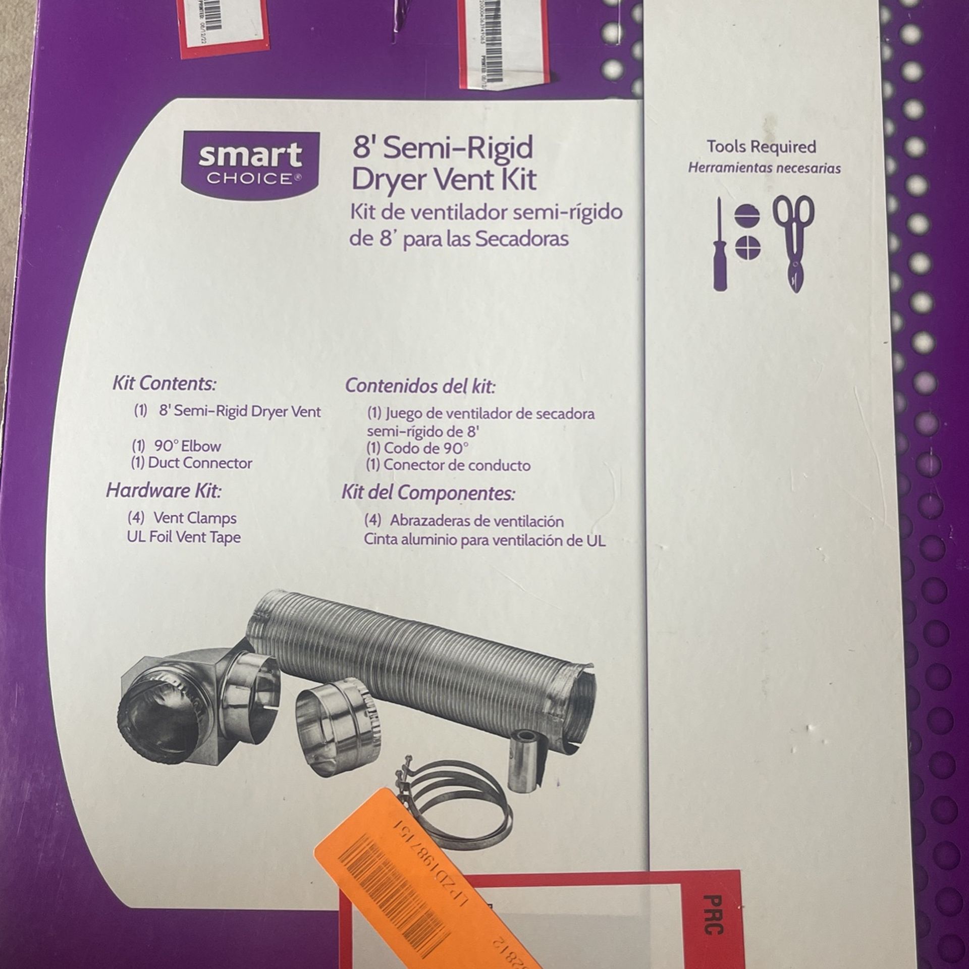 Enjoy efficient heat removal with the strong, eight-foot-long Smart Choice universal semi-rigid dryer vent kit. With everything you need to install any brand of dryer into your laundry room, this kit is made from durable stainless steel instead of aluminum foil, for added fire safety in your home. The rigid and flexible design conveniently fits any laundry room configuration. 90 degree elbows provide crush protection at critical points to help enhance drying time Tape provided helps seal connections for best airflow. Clamps secure connections between duct and elbows and at the wall and dryer. Distressed Box