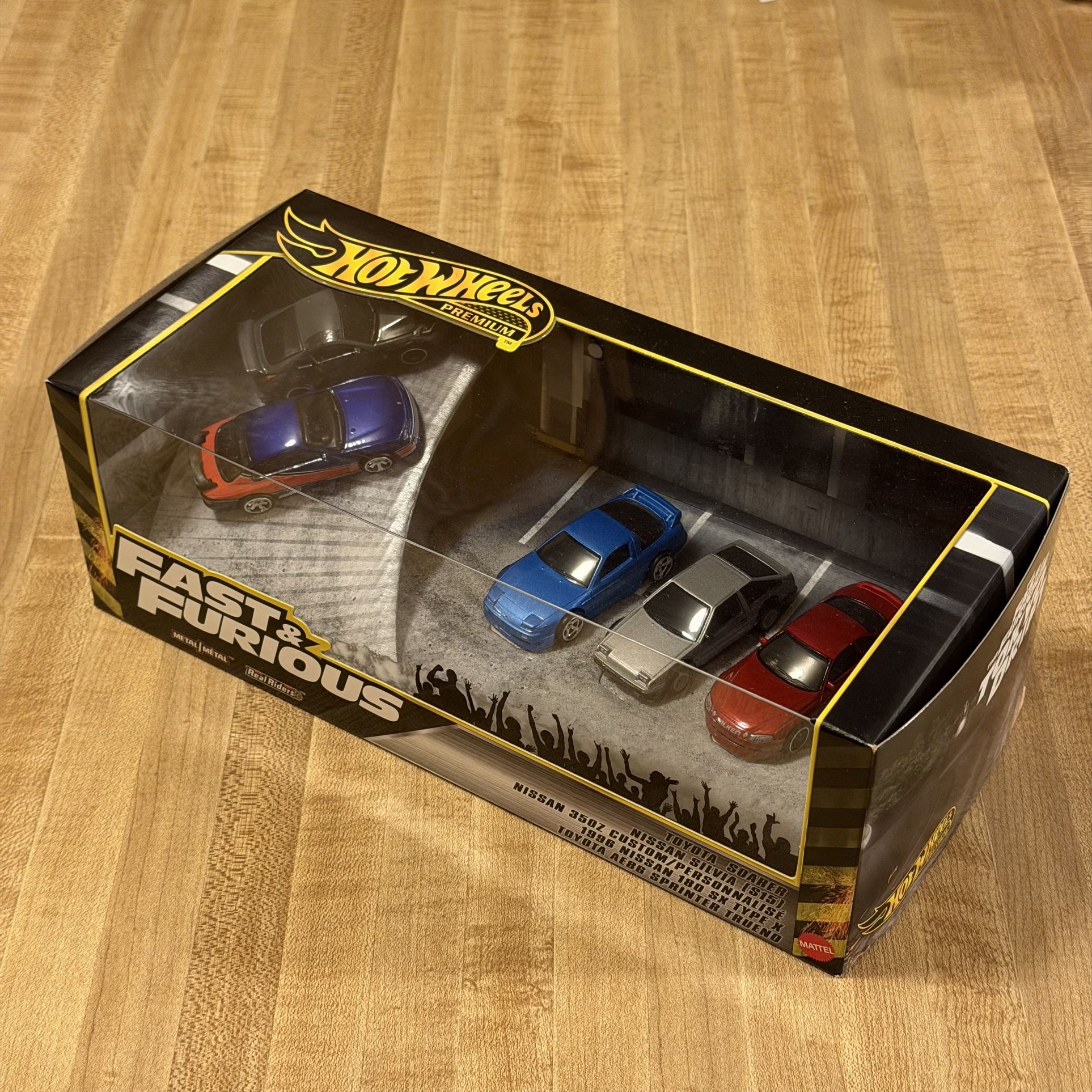 New Hot Wheels Premium Diorama The Fast & The Furious: Tokyo Drift Toyota Soarer Nissan Silvia (S15) Nissan 350Z Custom 1996 Nissan 180 SX Type X Toyota AE86 Sprinter Trueno I am also open to trading for a Hot Wheels Premium Honda Diorama.