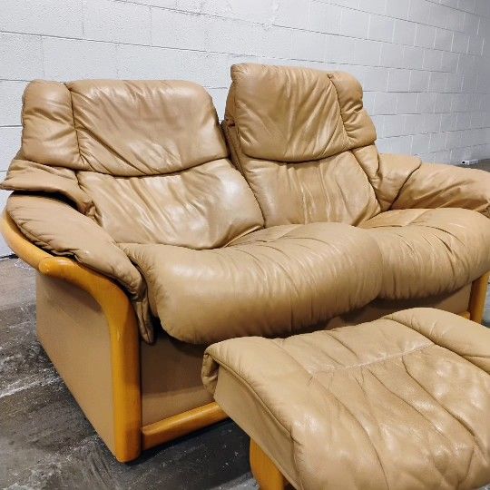 Contemporary Reclining loveseat by Ekornes. Made in Norway this "El Dorado" lounger is paired with a footrest, both in Camel color leather and a natural oak finish. Stunning, comfortable & all the things modern. Dimensions: W67 x L29 x H37in FCFS. No holds without deposit. Shipping available. Follow for more @StockbridgeCollective