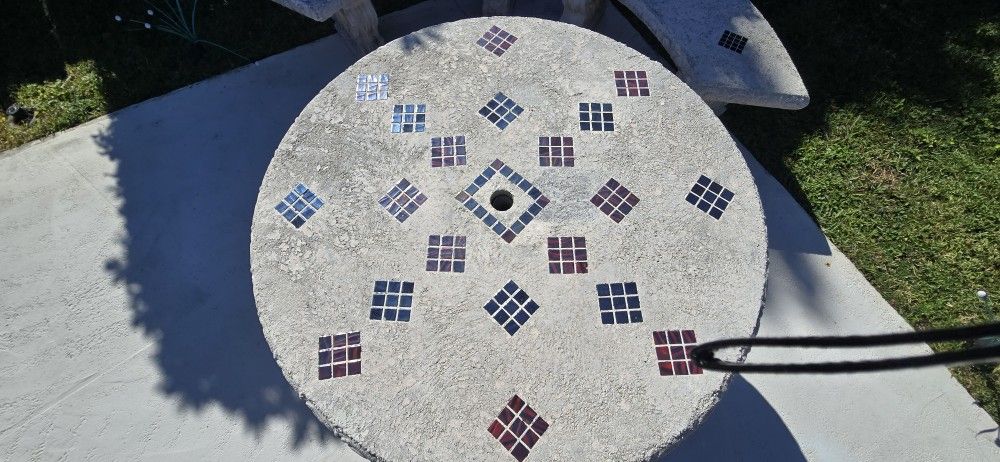 Beautiful mosaic tile concrete patio table with two benches in great condition. Has a precut umbrella hole in the table. Heavy duty furniture, all tiles are perfect with no chips. Table measures 41 inches across and benches are about 46 inches long. Easily seats four people.