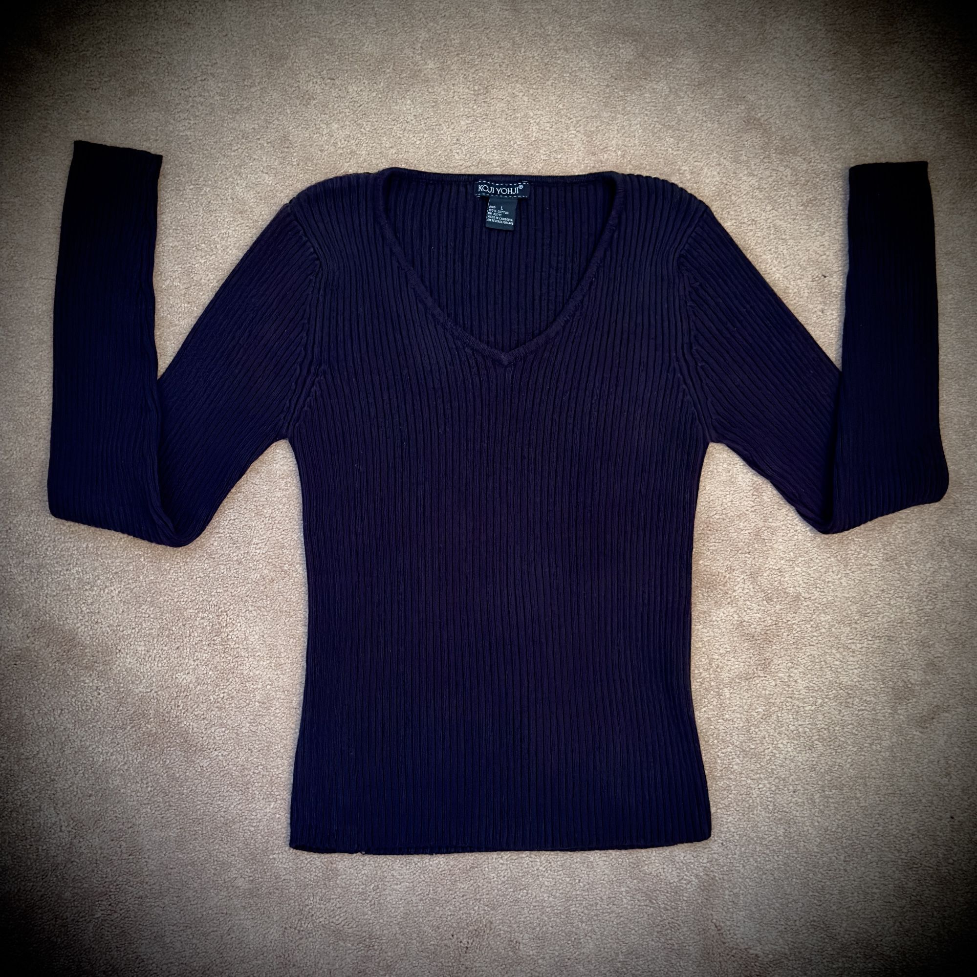 We are pleased to present an exquisite Koji Yohji knit sweater, offered in size Large. This distinguished garment is meticulously crafted from 100% pure, premium cotton, promising exceptional comfort and a luxurious feel against the skin. The design showcases an elegant V-neck silhouette in a classic black hue, subtly enhanced by delicate vertical ribbing. This considered detail not only adds to the sweater's sophisticated aesthetic but also contributes to its breathable quality, making it an ideal choice for refined, comfortable wear. This exceptional piece has been maintained in impeccable, excellent condition, reflecting meticulous care and attention. It originates from a pristine environment that is both pet-free and smoke-free, ensuring its utmost quality and freshness. For precise measurements and a comprehensive visual overview of the garment's condition, we direct your attention to the accompanying photographs.