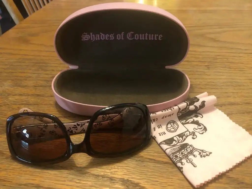 High desert south Adelanto pick up- Excellent condition Juicy Couture Sunglasses Set Rx very strong prescription not known exactly. Tinted darker to lighter fade top/ bottom. Big Brownish Red Clear / Shiny Gold trim sunglasses, nice leather JC logo pink case & soft microfiber big square cloth. All nice barely was used excellent condition,$65 only as their real nice. Leather pink logo print case w/brown soft fuz felt material inside & name. Inside arm pink logo & heart slot at 1 side end seen picture. Lenses at bottom has few couple very tiny speck dots but barely able to see them. Has bit curve out lenses inside so most likely pretty strong prescription.