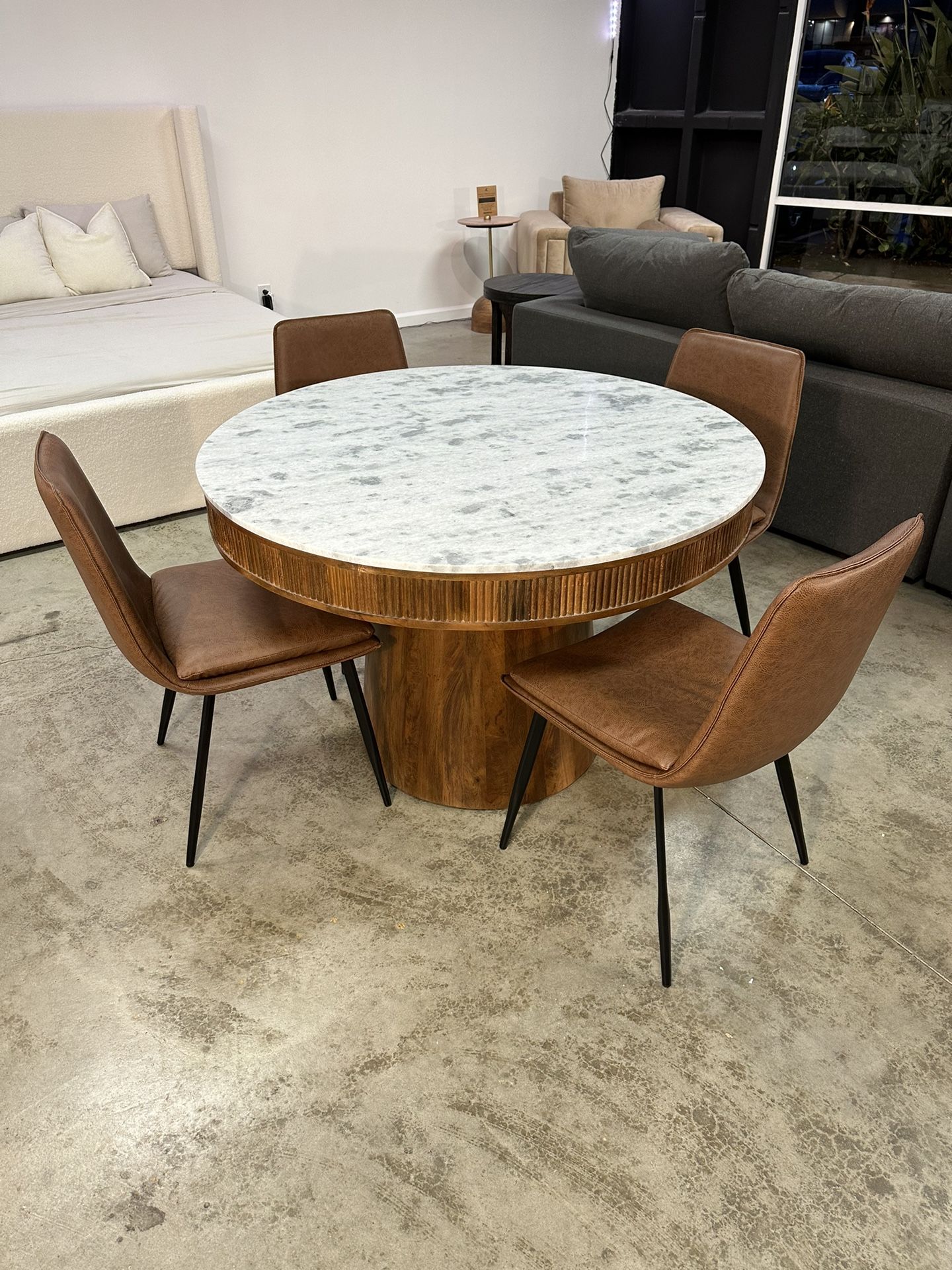 Fluted Dining Table Set with Genuine Marble Stone Top & Natural Mango Wood Base + Vegan Leather Chairs in Brown $995 🏷️ • SIZE 51” genuine marble top table • PRE-BUILT natural mango solid wood crafted • FEATURES 4 vegan leather chairs with solid steel preassembled structure. •VIBE gives a coastal feel, remains elegant, exudes a mature look with natural elements & curves. Delivery & Install Available ☑️ Buy Now Pay Later Financing 💳 Message us for details or follow @decornersd @decornerfurnitureboutique more insight of our furniture solutions. SAVE THOUSANDS 💸 Styling your home shouldn’t have to cost you a fortune. Get TOP designs & NEW arrivals BELOW Retail as we clear inventory for California & Woldwide Suppliers at LIQUIDATION PRICETAGS.