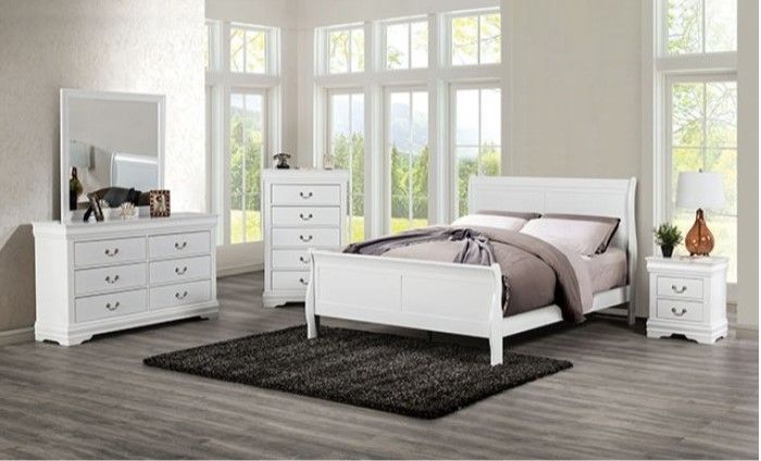 Brand new in a box delivered directly from the manufacturer. NO SHOWROOM Delivery Available Pay CASH, Zelle, Or Apple Pay at delivery. 4 Piece Queen Bedroom set includes Queen bed, Nightstand, Dresser & Mirror. Chest -$195.00 - SOLD SEPARATELY Mattress & Foundation not included White Solid Wood, Wood Veneer, Others Sleigh Design Hanging Drawer Pulls Dust Proof Case English Dovetail Drawer Bracket Feet Foundation Required Dimensions Queen Bed: 62.5W X 88.5D X 47H Nightstand: 21.5W X 15.5D X 23.5H Dresser: 58.5W X 15.5D X 33H Mirror: 38W X 1D X 38H Chest: 31.5W X 15.5D X 48H