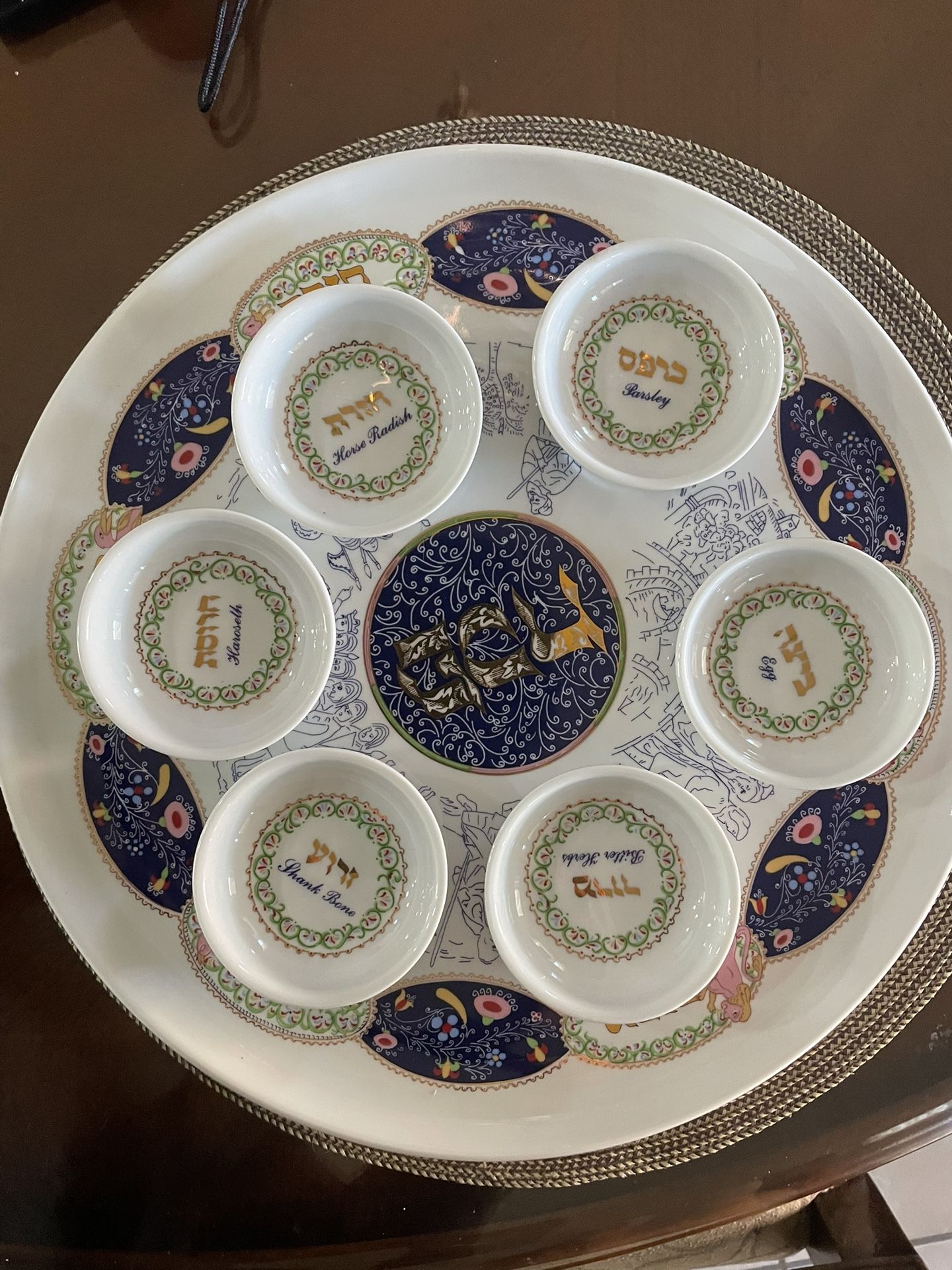 Naaman porcelain Seder plate with smaller bowls for each element. Plate is decorated with gilt Hebrew script against a blue background at its center; various figures and figural groups surround the center. Twelve ovals decorate the edge of the plate: half are decorated with floral and foliage motifs, half with animal motifs and gilt Hebrew script. Each smaller bowl is marked in gilt Hebrew script and blue English script and decorated with floral and foliage patterns. Each piece is marked on underside with green, stamped Naaman logo; set comes in box