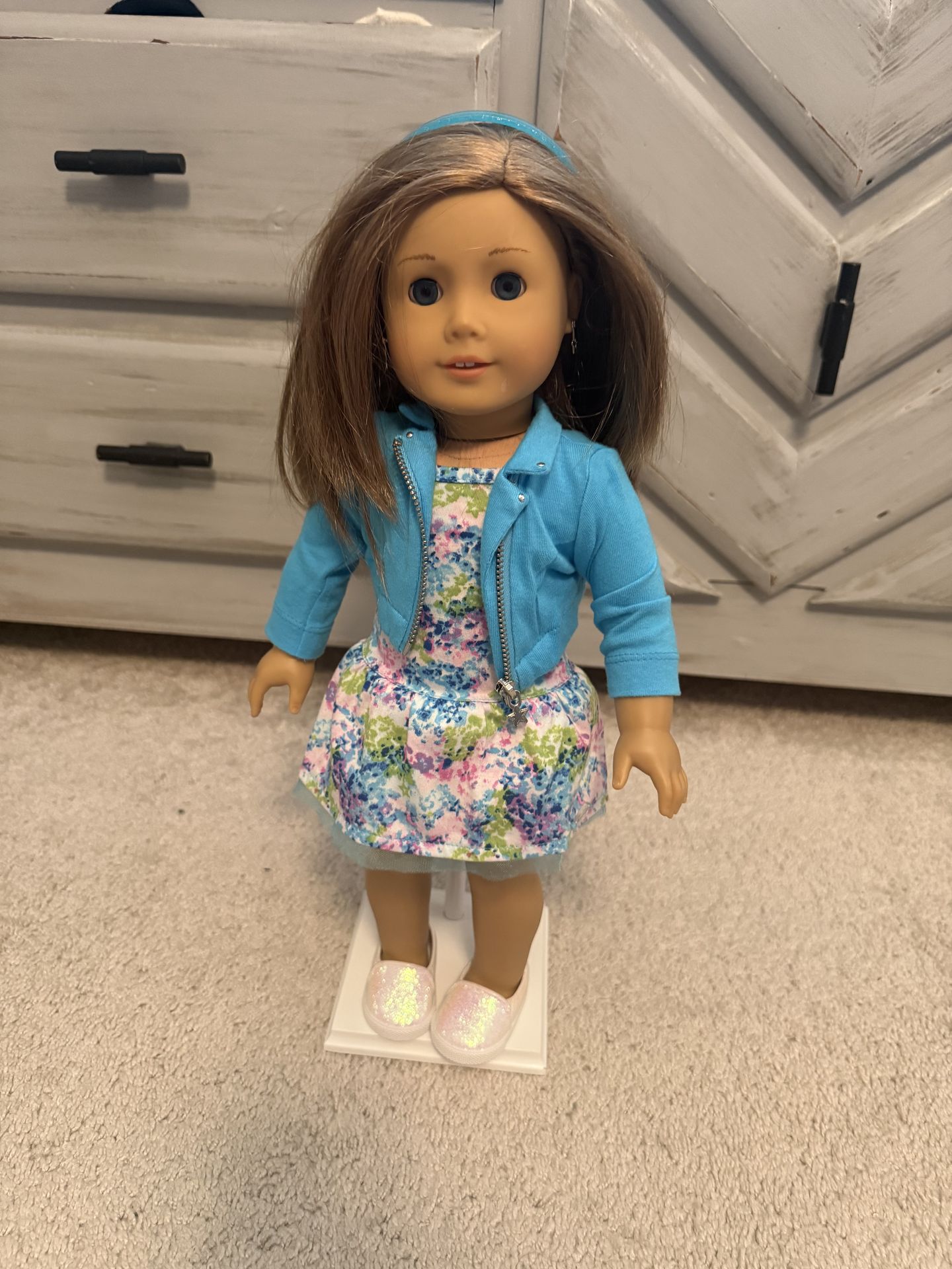 The product is an American Girl Truly Me Doll with blue eyes, ears pierced at American Girl doll store with earings. PRE-Owned in good condition. Sold as shown in pictures. American Girl Doll Stand included