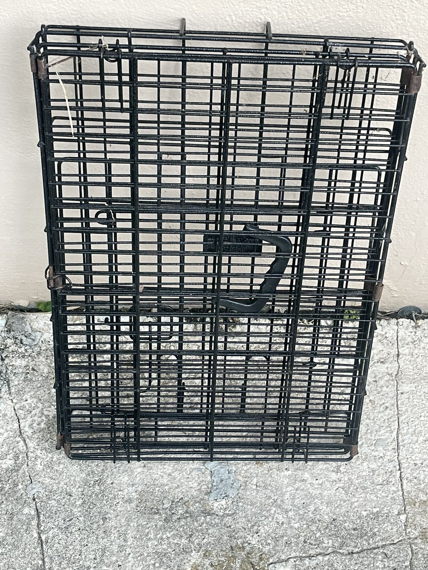 Easy storage pet or dog crate / cage. It folds up for easy storage. Comes with a handle. Made out of metal. Has some slight normal wear but works fine. Perfect for crate training or traveling