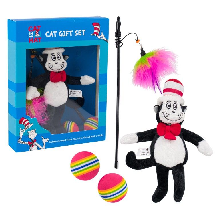 Brand New Packed. Keep your paw-friend happy and engaged with Dr. Seuss Cat in the Hat Gift Set. These toys are made of soft and safe materials for hours of fun. Includes wand teaser toy, stuffed Cat in the Hat, and two balls.