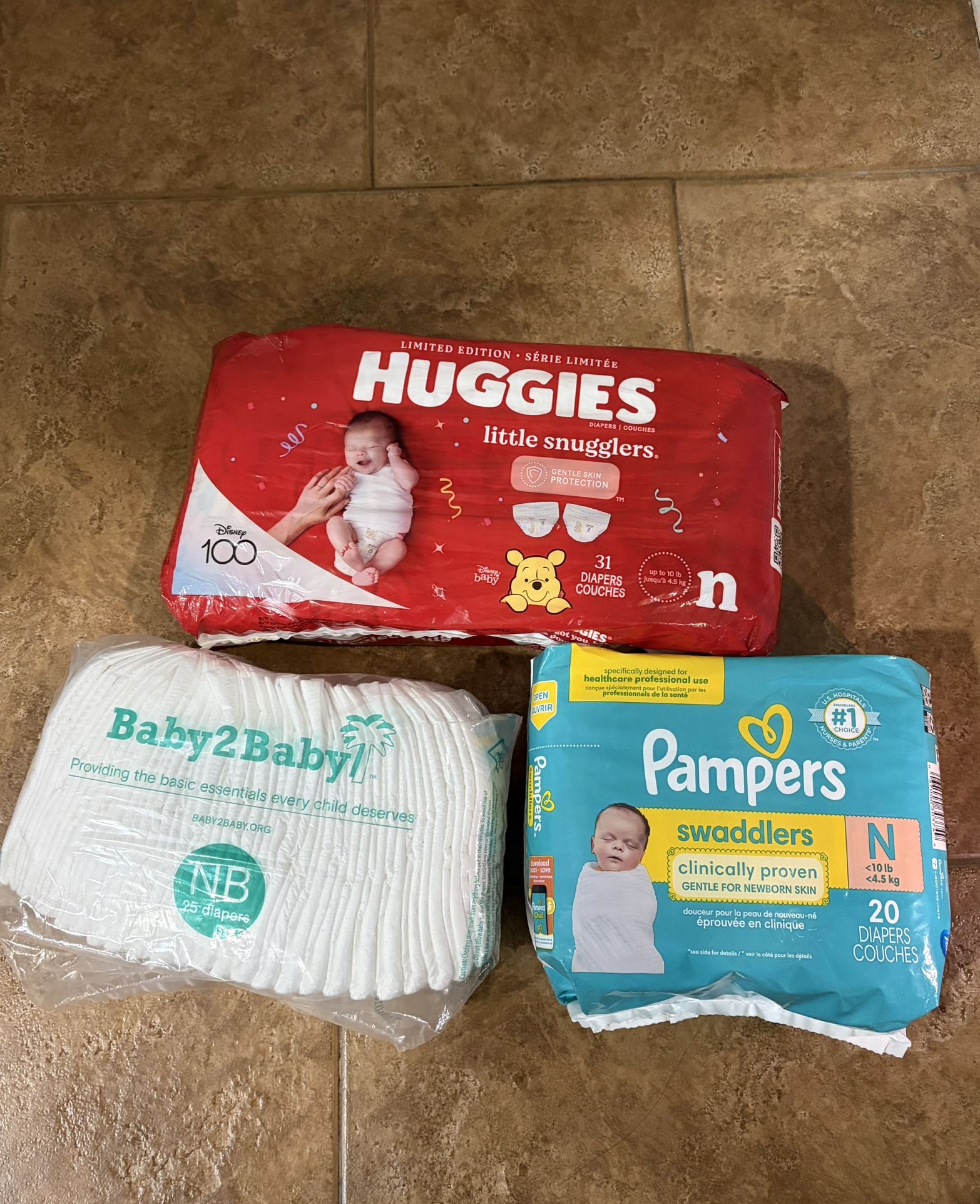Pampers Swaddlers – Newborn (N), 20 count • Huggies Little Snugglers – Newborn (N), 31 count • Baby2Baby diapers – Newborn size (sealed pack)