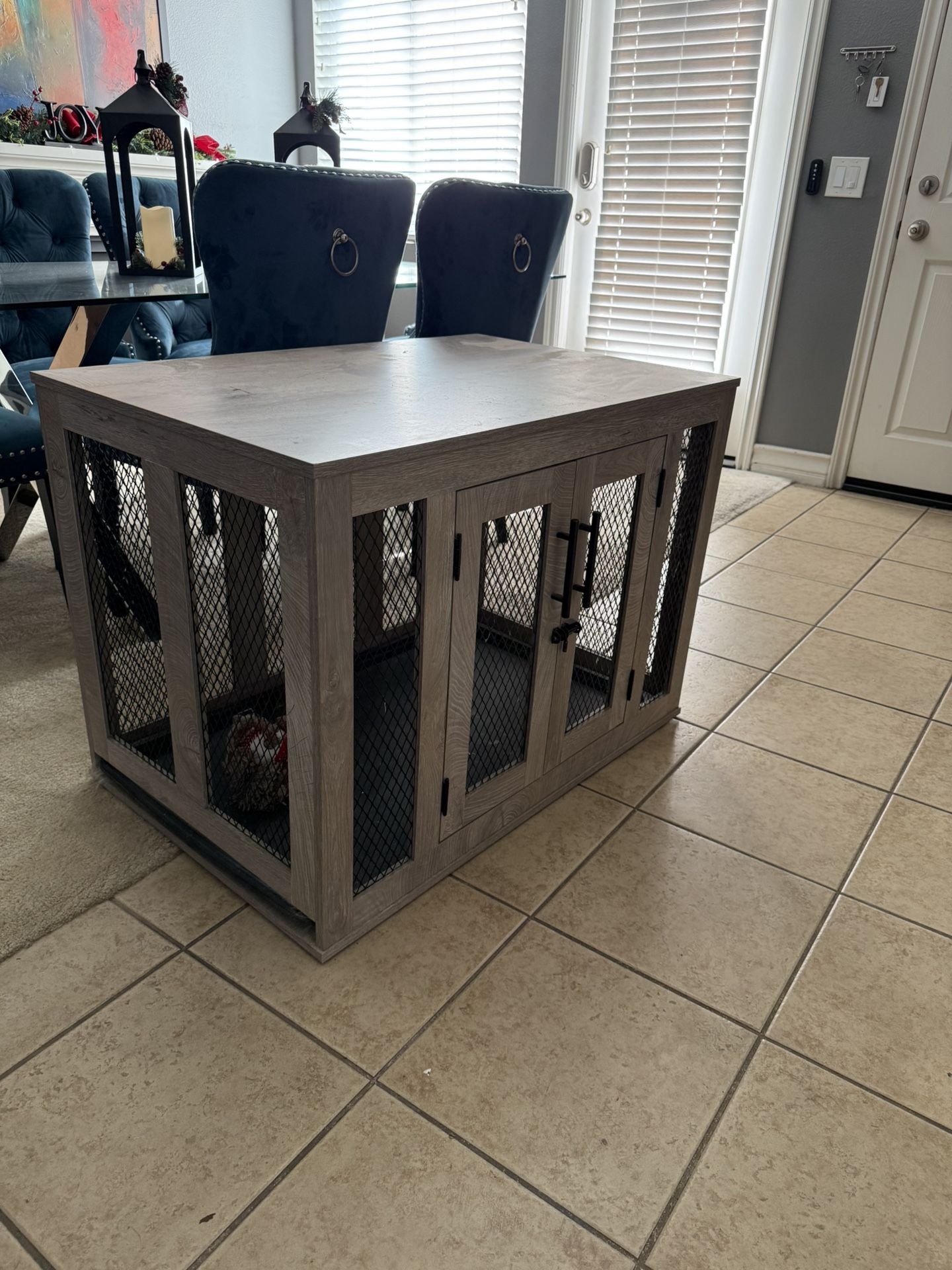 Stylish furniture-style dog crate in great condition. Solid and sturdy with metal mesh panels and secure latch. Looks great as a side table or accent piece while keeping your pet comfortable and safe. Dimensions: • Length: 37 inches • Height: 26 inches • Depth: 23.5 inches Details: • Neutral gray wood finish • Metal mesh sides for airflow • Front door with locking latch • Clean, no damage • Suitable for small to medium dogs