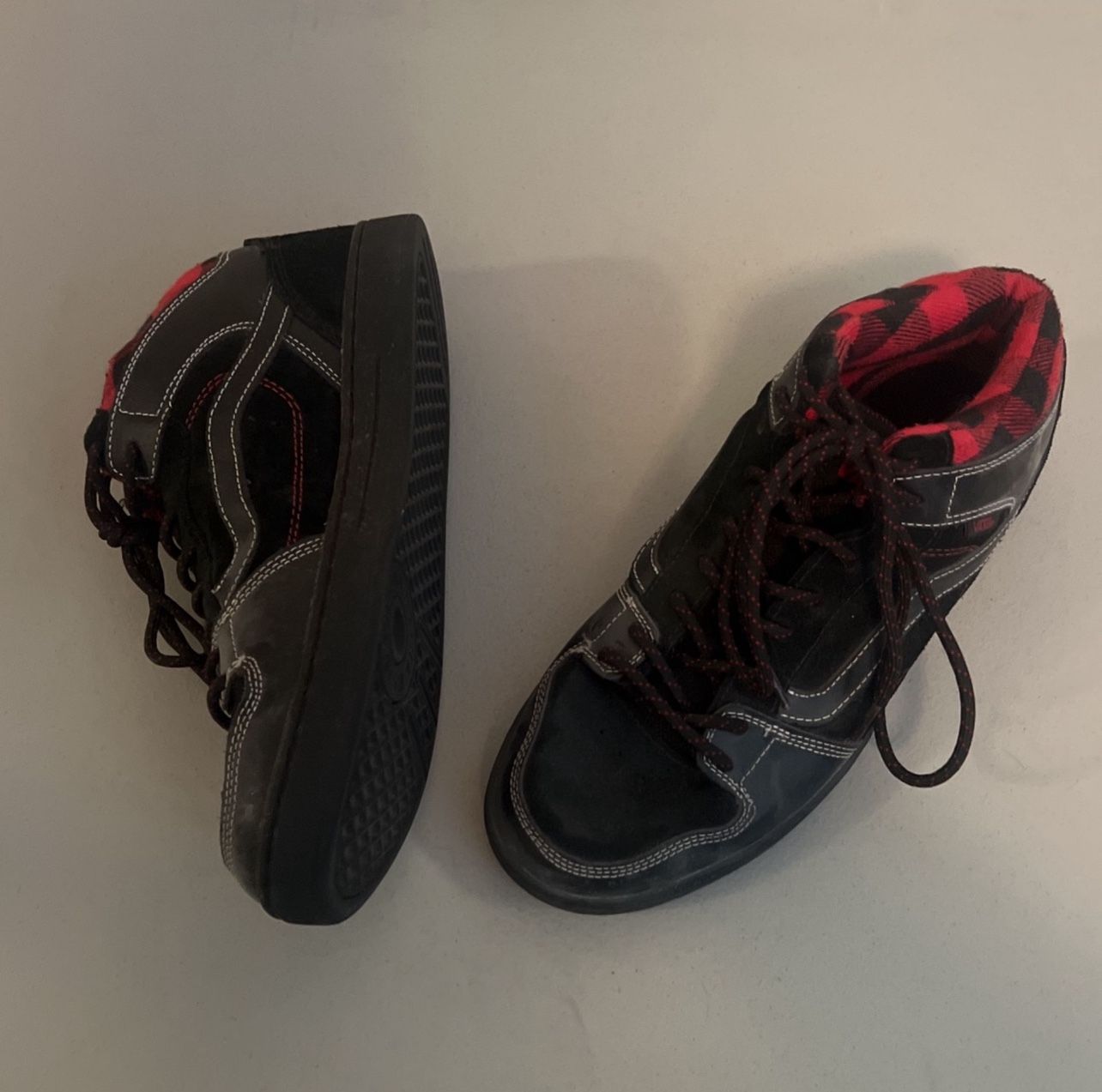 For Sale: Vans High Top skate shoes sz 10. Shoes are in like new condition. Tags were removed they were tried on but never worn out! Rare hard to find black with black & red plaid trim.