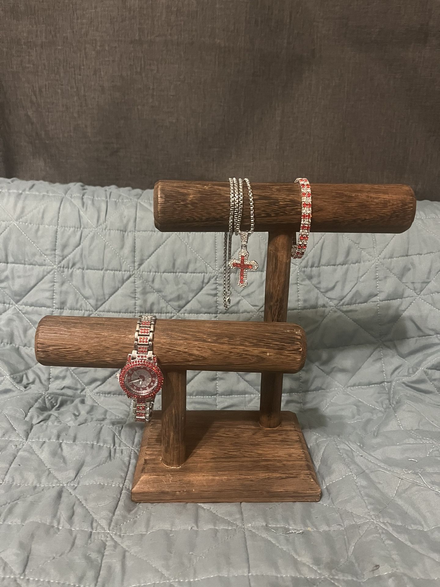 Retro Luxury Red Quartz Ladies Watch Set: Round Dial, Classic Charming Cross Pendant Necklace, Bracelet. Band width 8.6 in Bracelet width 7 in Necklace 24 in Shipping is available. Price is calculated by weight. USPS ground.