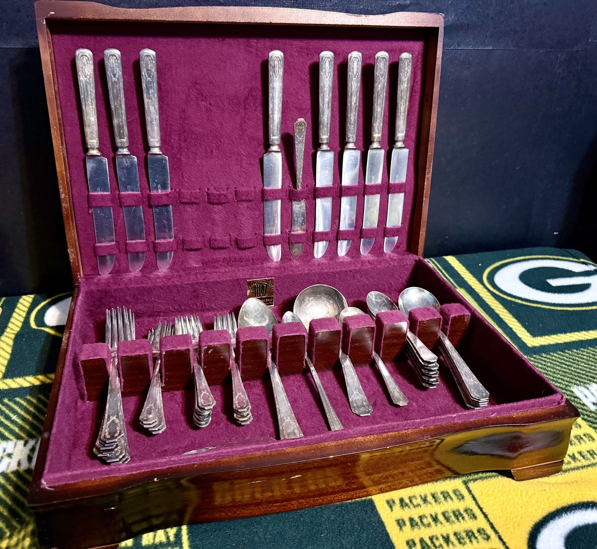 Vintage 1847 WM Rogers Aristocratic Silver Plate Silverware Set. The "1847" signifies the year Rogers patented his silver-plating process. Silver plated (a thin layer of silver over a base metal like copper or brass). 49 piece set. Includes original box. In good vintage condition. Measurements: 14” 1/2” wide x 11” deep x 3” height. Asking $75. Serious inquires only. Thanks.