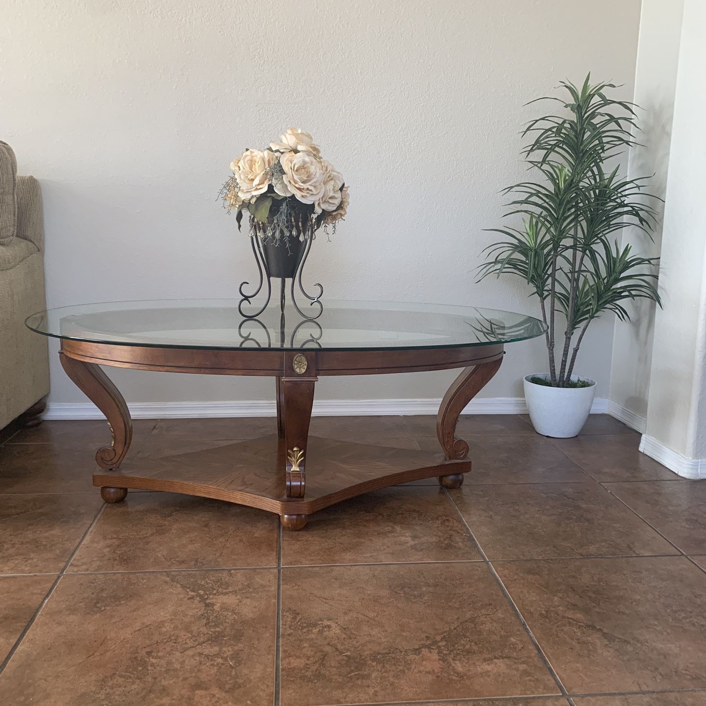 Coffee table , sofa table and two end tables. Glass is very heavy for all pieces. Needs some touch up on sofa table has a few scratches nothen too bad. Mirror and lamps are included in price.