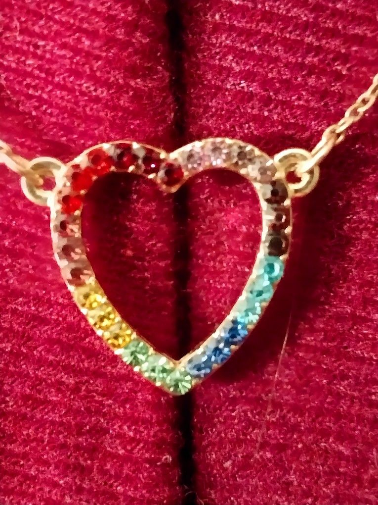 This is a vintage gold tone open heart necklace with a vintage magnetic barrel clasp. It is a multicolored stoned open heart rainbow pendant on a gold tone vintage chain. And it has the Vintage magnetic barrel clasp. (The chain came off at the end, and needs to be put back in the ring or just fixed.) For that I will be lowering the https://offerup.com/redirect/?o=cHJpY2UuaXM= pick up only.