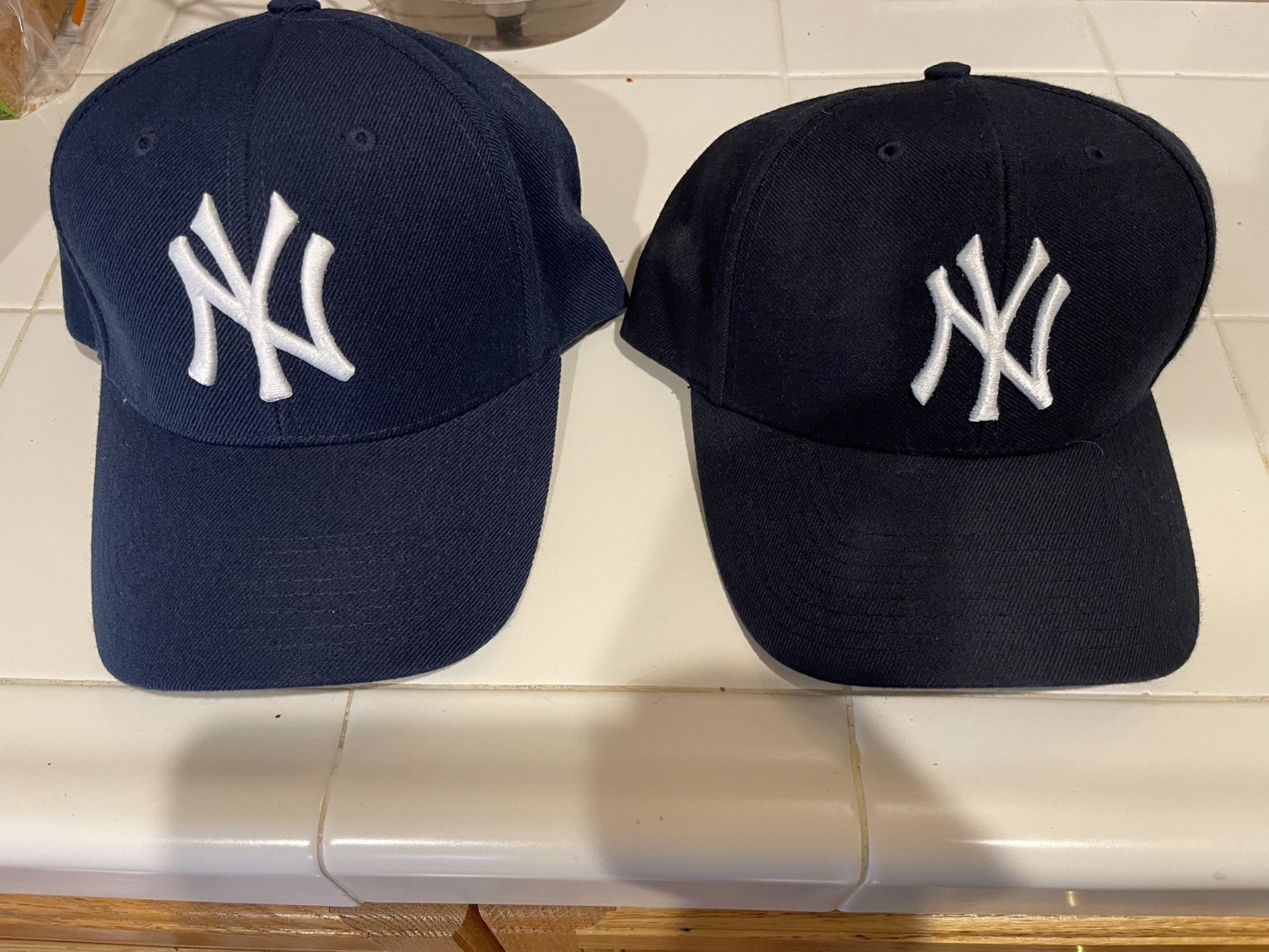 NY Yankees hats have name embroidery on them. One says Tucker other says John. Velcro back one size fits all. Asking 10 each