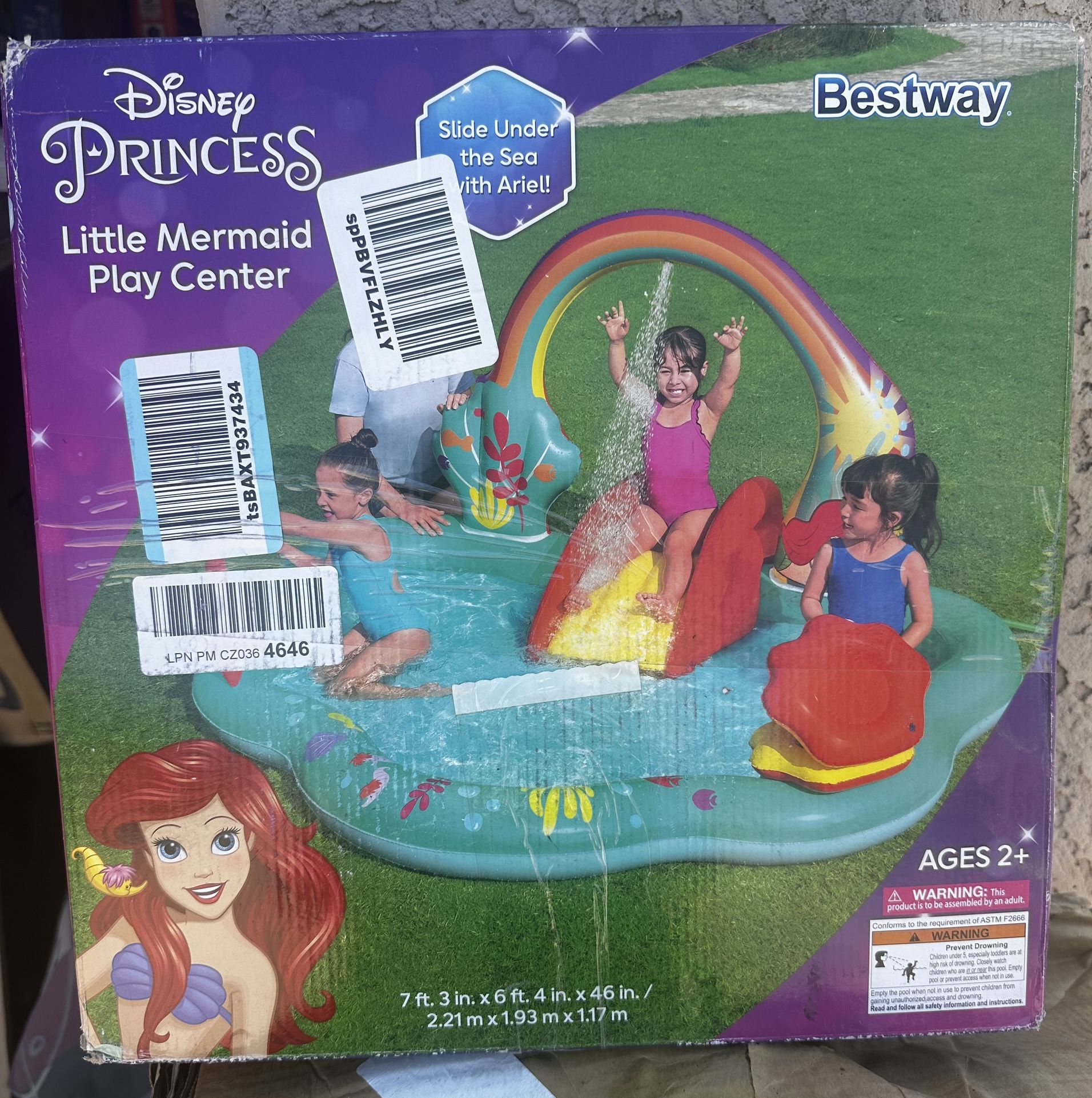Brand new in box, Disney Princess Little Mermaid play Center. Has slide with built in sprayer, Seashell ball toss with 6 balls and 3 ring toss.