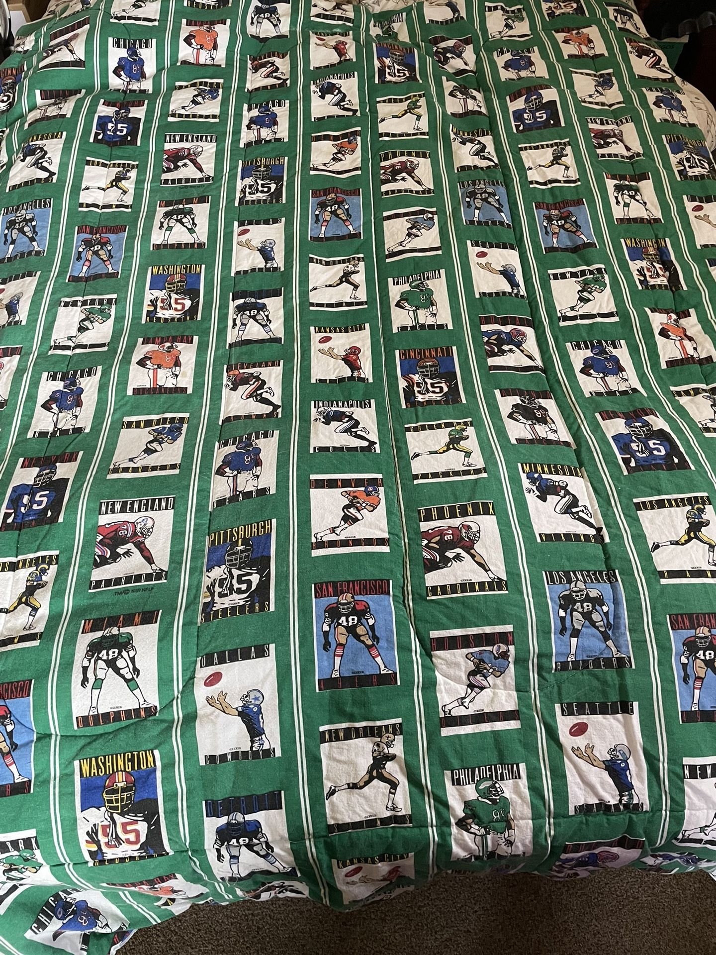 Used as is. 1989 NFL twin comforter with now defunct teams. One small rip that can be sewn. See pics