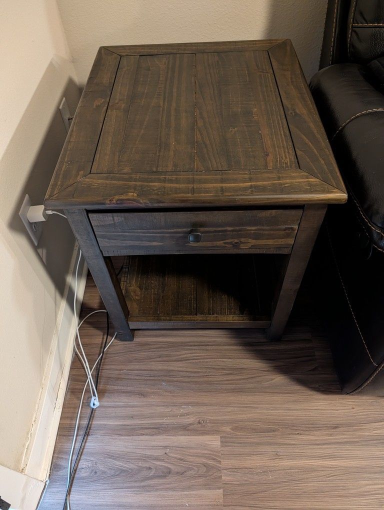 I'm selling two end tables. They're an asymmetrical set. One has two shelves, one has a shelf and a drawer.