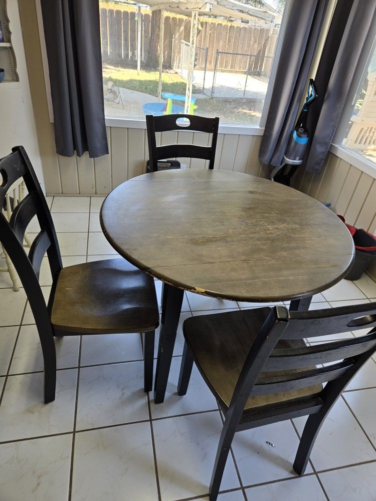 Kitchen table - seats 4. 4 dining chairs included (1 chair has a broken leg - not in photo) 40 inches round