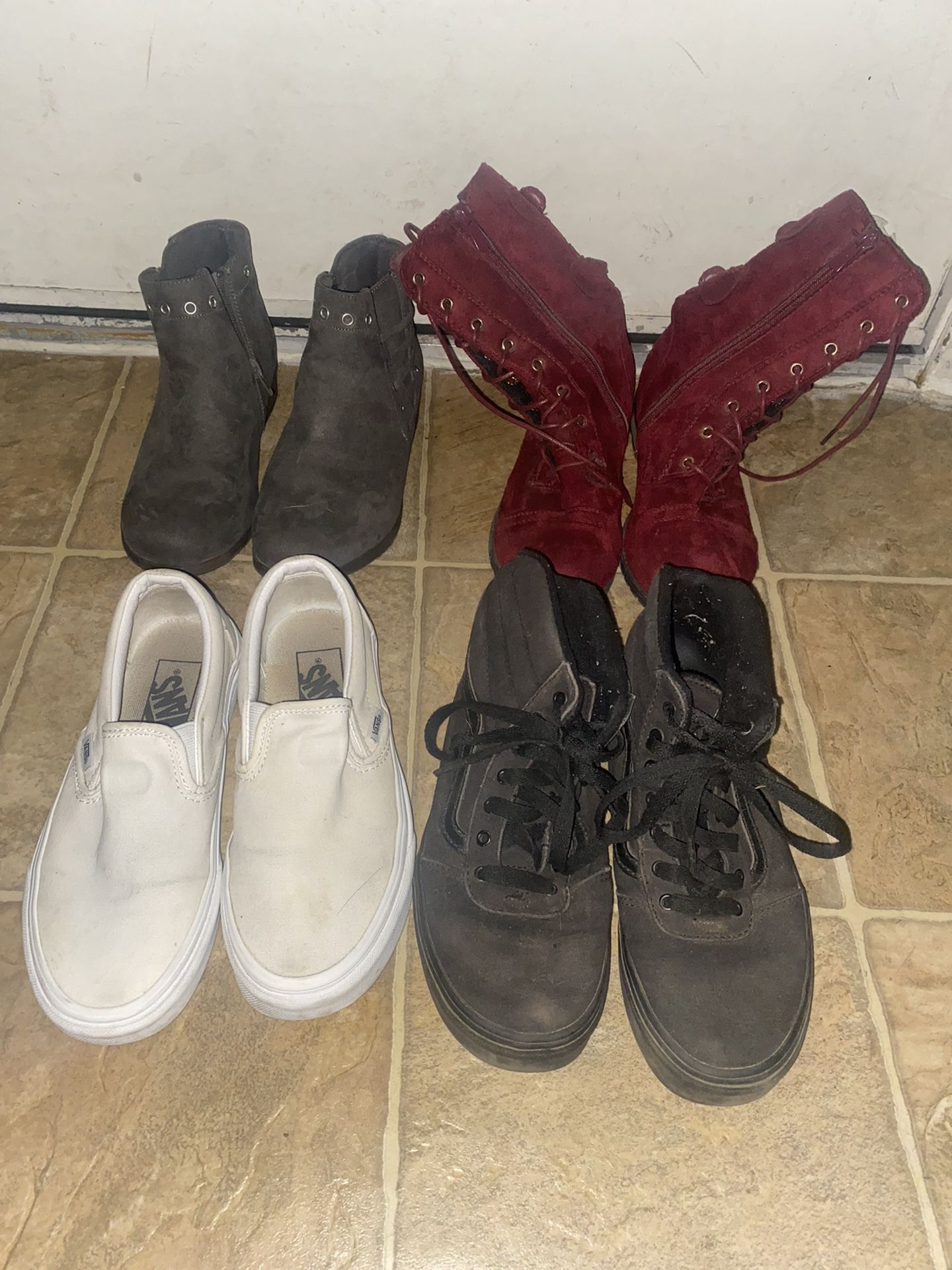 White vans size 5.5 (women) ❌SOLD❌ Black vans size 4.5 (youth) Grey booties size 4 Margoon boots size 4 $5 each (price is firm)
