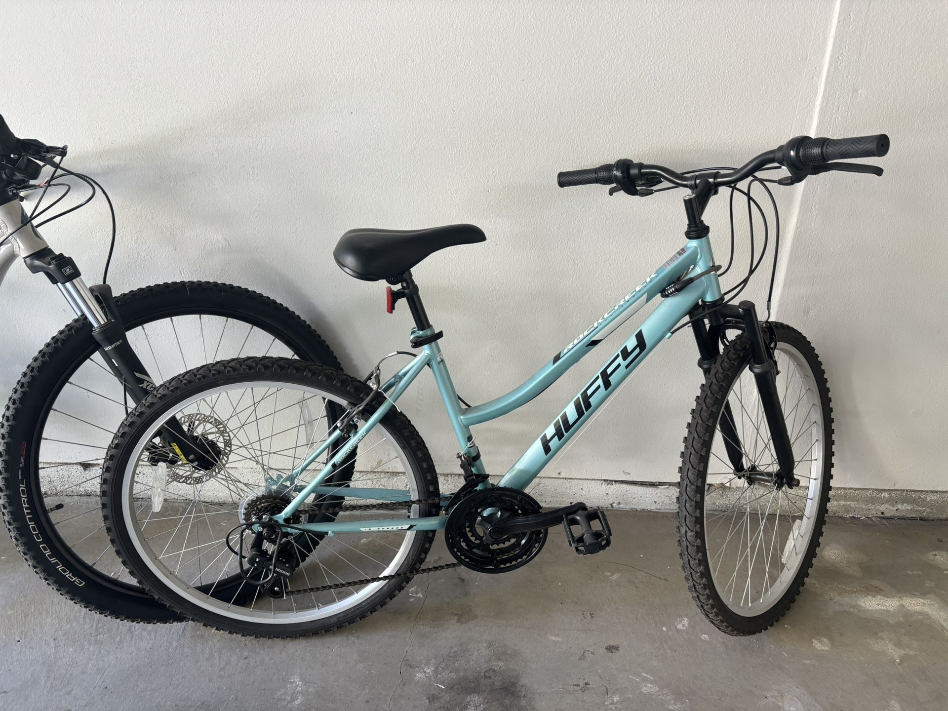 Excellent condition, barely used. Light blue Huffy Rock Creek mountain bike with step-through frame — easy to get on and off. Smooth ride and great for neighborhood rides, trails, or casual commuting. Details: • Brand: Huffy • Model: Rock Creek • Women’s step-through frame • Front suspension fork • 18-speed gears • Knobby tires for trail or street riding • Comfortable saddle • Rides great, everything works properly Condition: Very good / like new Pickup only. Cash or app payment accepted.