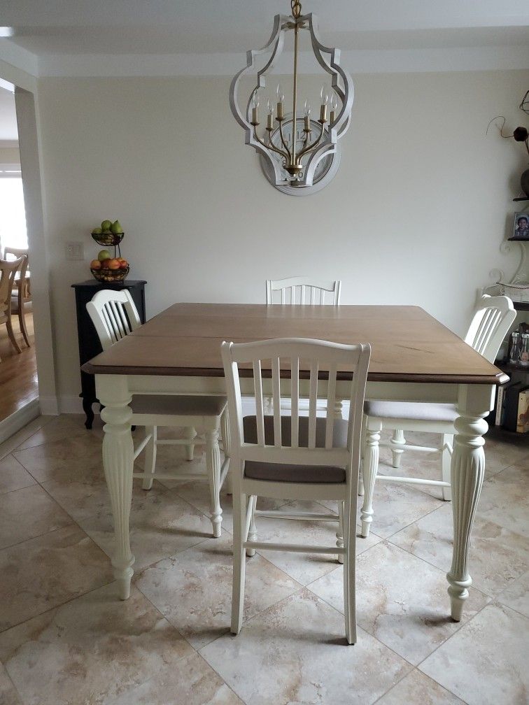 COUNTER HEIGHT TABLE & CHAIRS. ***BRAND NEW IN THE BOX!!!*** ( PHOTOS SHOWN ARE SAME EXACT SET AS WHAT IS IN BOX) TABLE IS 54X36 WITH LEAF, TABLE IS 54X54 4 STOOLS SET IS BEAUTIFUL!! AND NEW!!