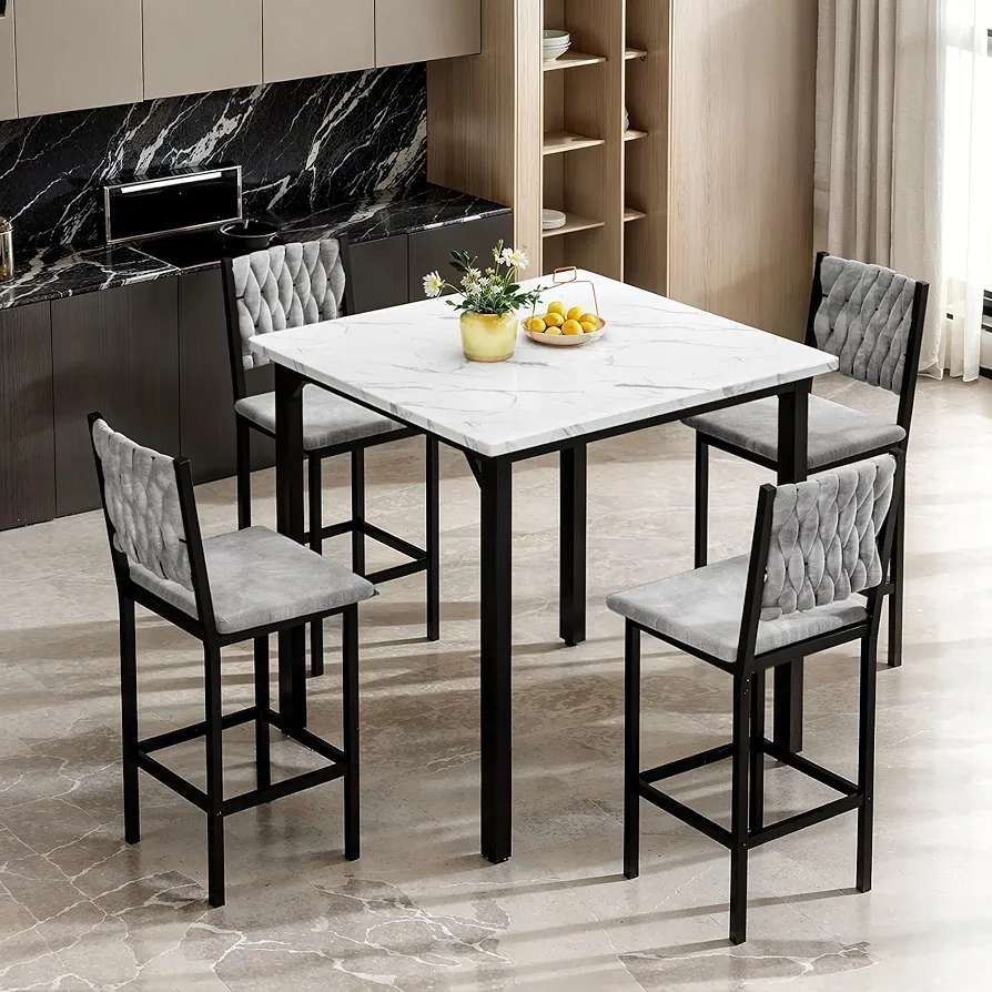 New in box, pick up in Pomona. ColorMarble Texture & Velvet Chairs Item Weight82.2 Pounds StyleModern, Contemporary Assembly RequiredYes Shape1 【 Comfortable Chair 】 : AWQM 5-Piece dining table set, with 4 velvet bar stools. The padded seats are filled with high-density foam and paired with ergonomically designed curved backrests that perfectly conform to the body's natural contours, offering exceptional comfort. Whether working, dining, or relaxing for extended periods, they effectively reduce back pressure and fatigue, ensuring a more comfortable experience. 【 Space Saving 】 : The counter height table optimized for small spaces, the chairs can be fully tucked under the table, saving significant floor space and making them ideal for compact apartments, kitchens, or living rooms. The compact size and smart structural design maintain functionality while keeping the area tidy and visually appealing, making it a perfect choice for small-space homes. 【 Suitable for Various Scenarios 】 : This 5-piece dining table set is not only suitable for daily meals but also functions as a desk, computer table, workstation, or leisure area, meeting the needs of various living scenarios. Whether for family gatherings, afternoon tea, or work and study, it effortlessly adapts to different roles, offering a versatile and flexible experience. 【 Strong and Durable 】 :The table surface is made of FSC-certified wood.Constructed with high-quality MDF tabletops and thickened metal frames, the dining table set for 4 is sturdy and durable, capable of supporting a total weight of up to 250 lbs. The reinforced table and chair legs ensure stability without wobbling or tilting during use, providing a safe and reliable experience for long-term family use. 【 The Convenient Cleaning Maintenance 】 : The 5-piece dining table set are coated with waterproof, stain-resistant PVC, effectively repelling stains and grease. Daily cleaning is as simple as wiping with a damp cloth, saving time and effort. Additionally, the smooth rounded edges prevent accidental bumps, ensuring family safety and extending the furniture's lifespan.