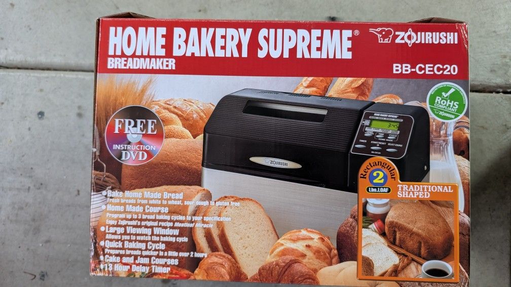Brand new in the box, retails for $370 BB-CEC20BA Dedicated bakers will love the convenience of making fresh bread – as well as cake, jam and sourdough starters – in this versatile machine. Crafted by Japan-based Zojirushi, it features three memory settings so you can customize and store the knead, rise and bake times of your favorite recipes. The 13-hour countdown timer helps you stay on top of the time while the auto-shutoff function ensures safe operation. Bakes 2-lb. loaf. Preprogrammed settings include White, Whole Wheat, Cake, Jam and Sourdough Starter. Quick Bake Wheat setting makes whole-grain bread fast using rapid-rise yeast. Sourdough Starter function prepares starter in approx. 2 hours. 3 memory settings for customizing and storing knead, rise and bake times. Dual blades ensure thorough kneading. Convenient 13-hour countdown timer. Auto-shutoff function ensures safe operation. LCD control panel simplifies selection. Nonstick baking pan removes for cleaning. Comes with wet measuring cup, measuring spoon, recipe book and instruction manual.
