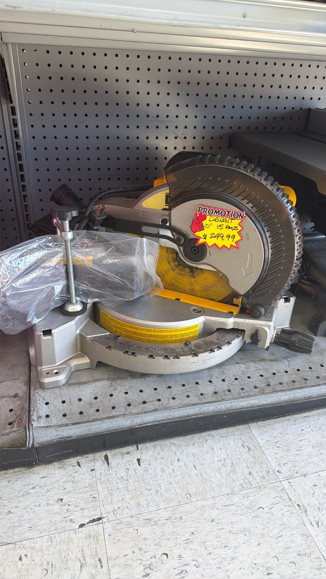 DEWALT 10-inch single-bevel compound miter saw. Model # DWS713 A 15 Amp motor that delivers 5,000 RPM for power and durability. A stainless-steel miter detent plate for repeatable accuracy and easy adjustments. A 10-inch blade diameter with a 6-inch depth of cut at 90 degrees.
