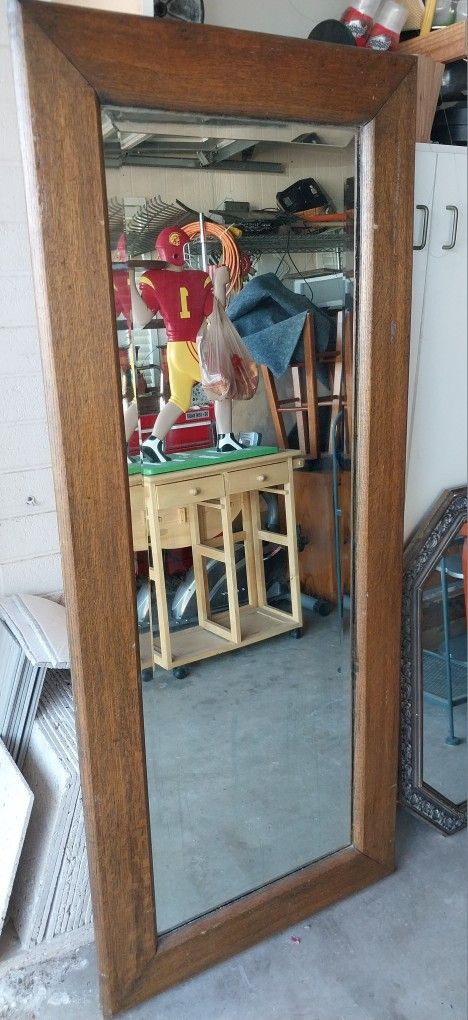 This is an Old mirror It is currently sitting upside-down 69 1/2" tall x 29 1/4" wide The mirror itself is 60" tall x 20 1/8" wide Its hard to see in the pictures, but there is a blemish on the mirror behind the center cross support board.