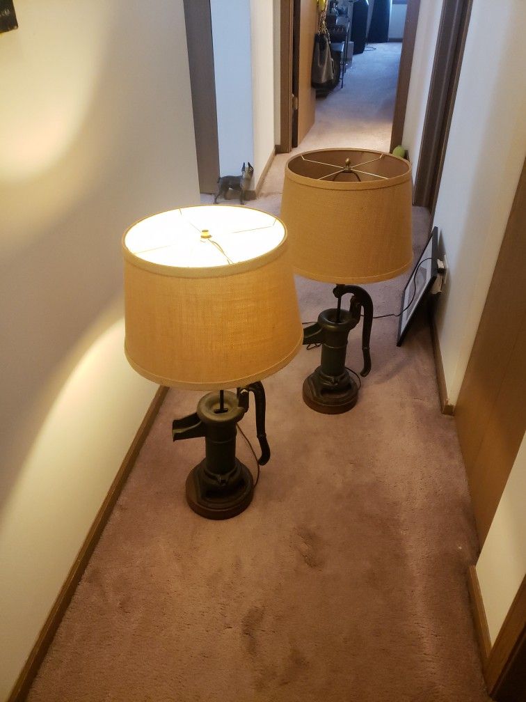 2 Antique real Water Pump Lamps Veryyy well made & heavy Beautiful pcs Hand made & works Please see photos for measurements You can always replace the shades if you like too If you have any questions please feel free to contact me.