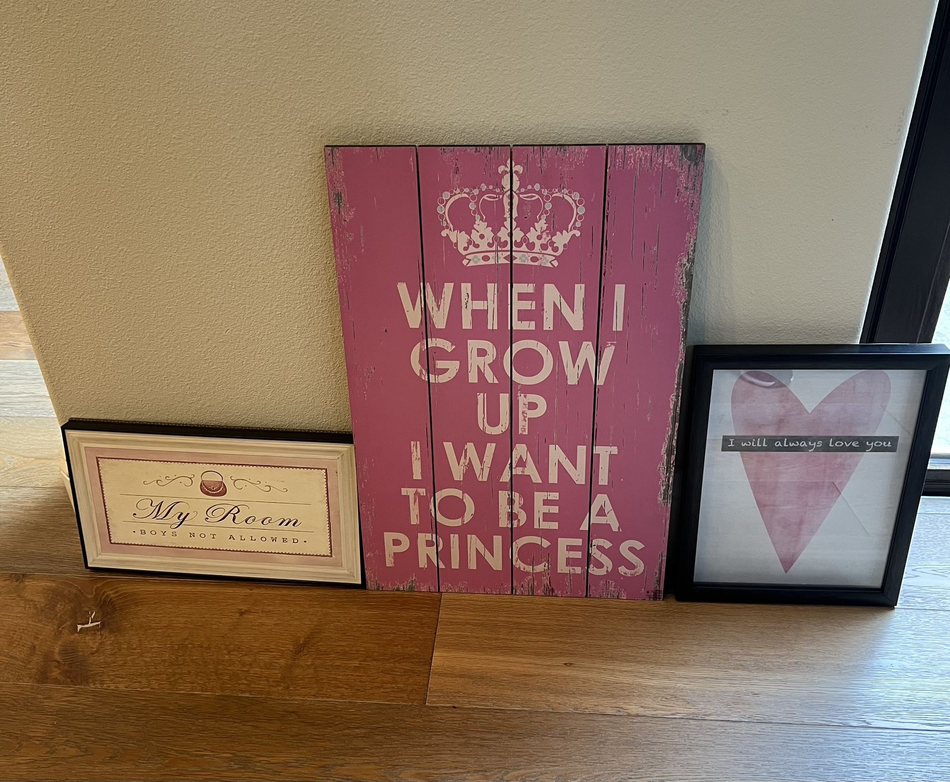 In perfect condition. Sold as a set of 3. First “ my room” 15 1/2 “ x 8 1/2” Second “princess” 16”x 24” Third “heart” 11” x 14 “